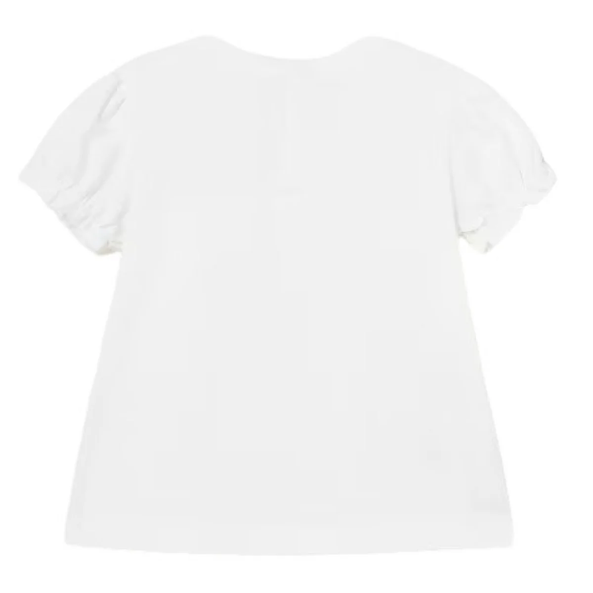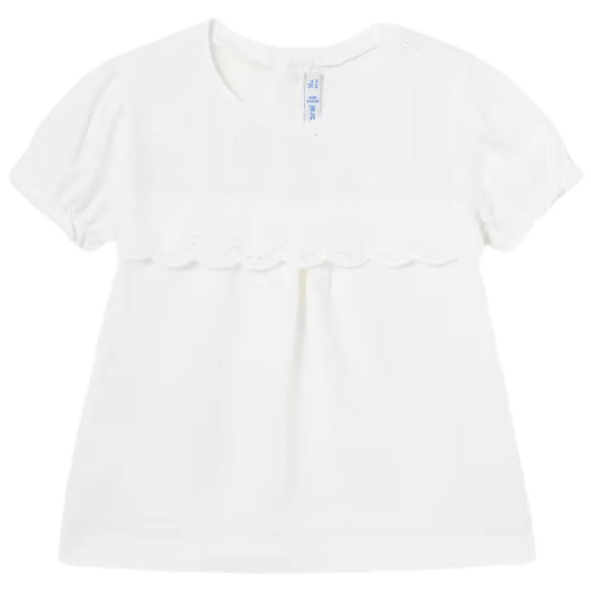 T-shirt MAYORAL in cotone con ricami e trafori applicati, elastico alle maniche, chiusura con clips sul retro.