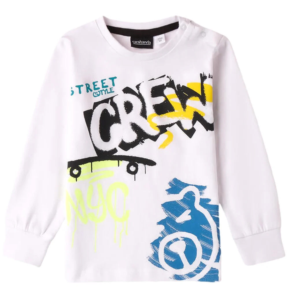 T-shirt SARABANDA in cotone con stampa ,chiusura su spalla con clips .