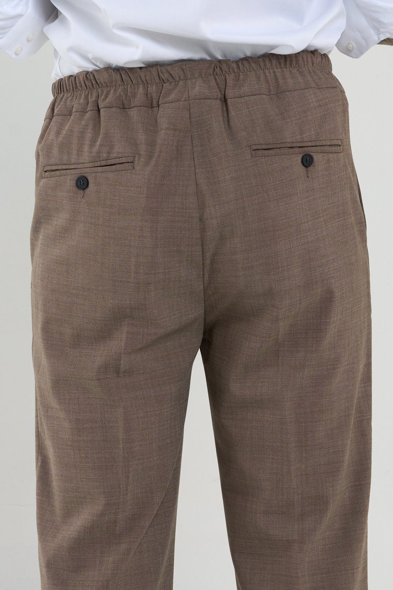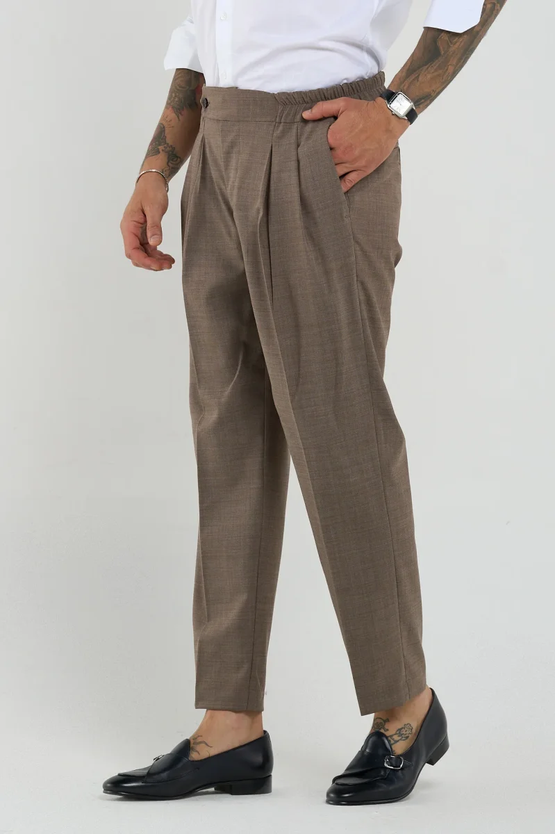 Questi pantaloni rappresentano l’equilibrio ideale tra comfort dinamico e raffinatezza sartoriale, perfetti per chi viaggia spesso o desidera un capo versatile per il lavoro e il tempo libero. Taglio morbido e affusolato, con pinces frontali che donano volume e movimento alla parte superiore, mantenendo una linea pulita sulla gamba. La fascia posteriore completamente elasticizzata, invisibile frontalmente, che assicura comfort anche durante lunghi spostamenti o sedute prolungate (in aereo, treno, auto).