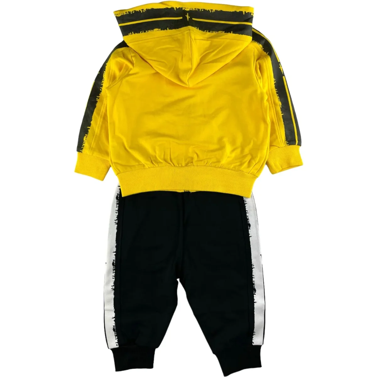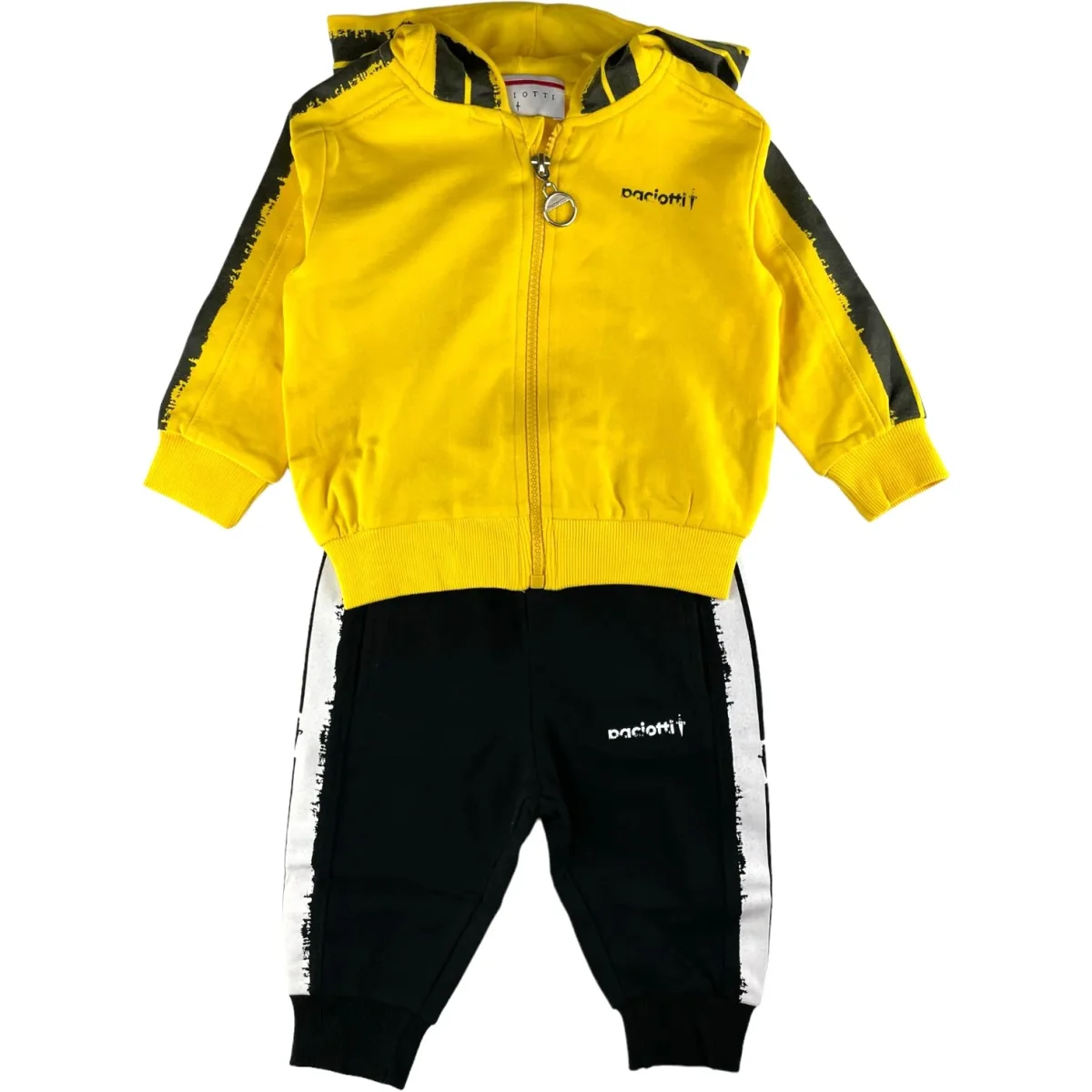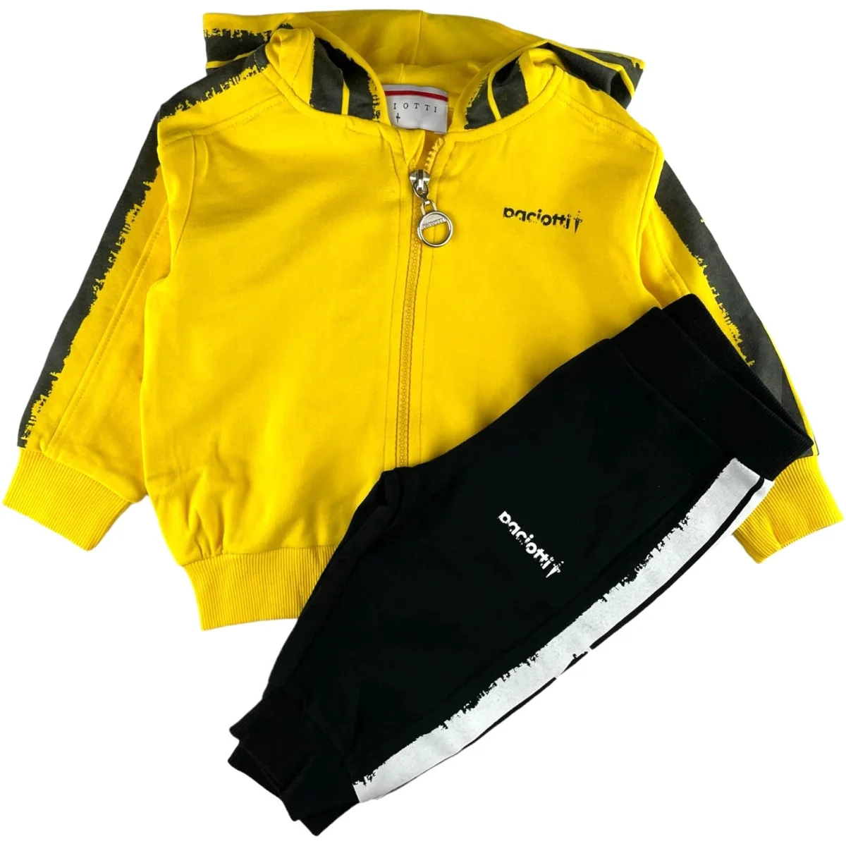 Tuta CESARE PACIOTTI in cotone garzato, felpa con cappuccio e chiusura zip intera con stampe a contrasto. pantalone coordinato con elastico in vita ed alla caviglia.