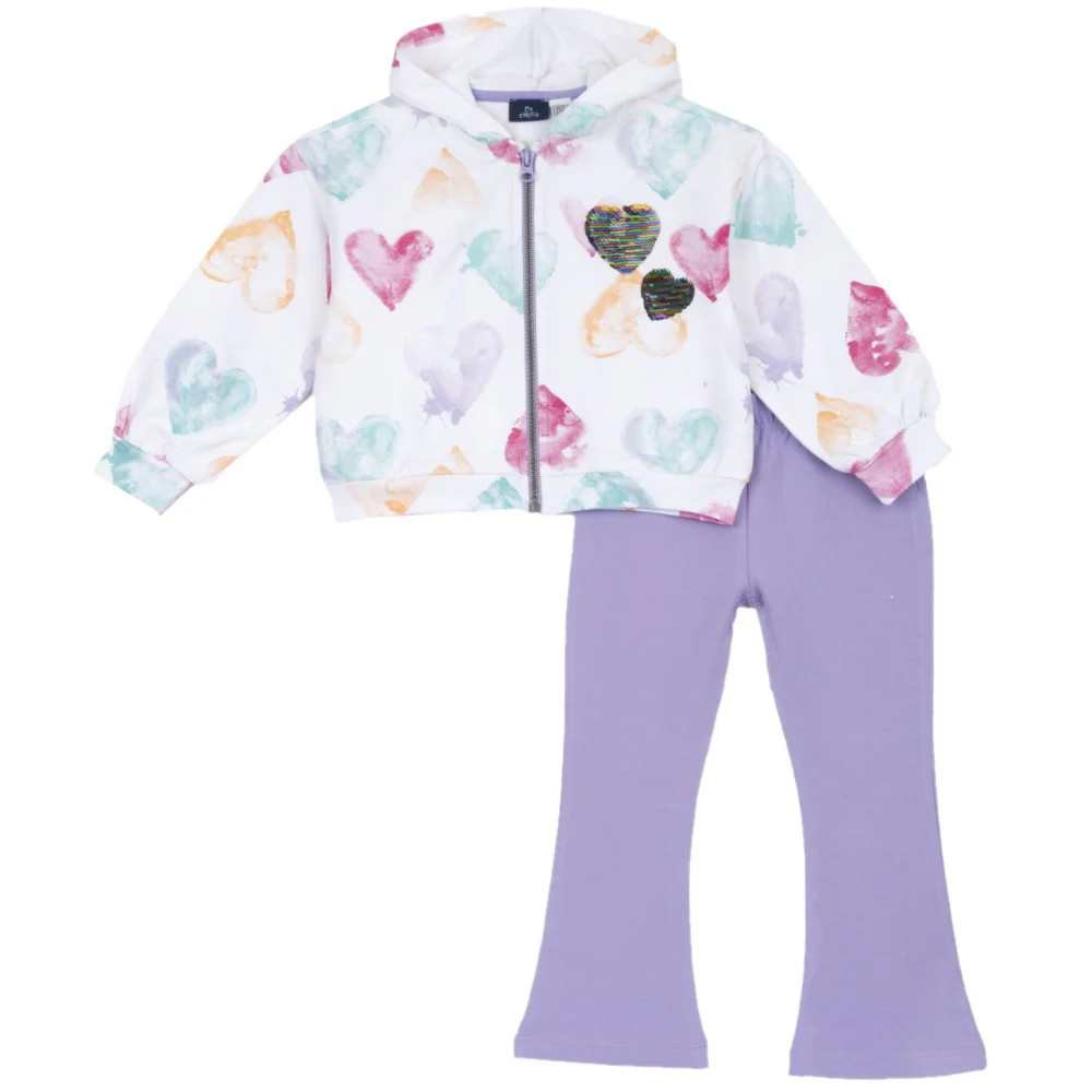 Tuta CHICCO in cotone con interno garzato con felpa con chiusura zip e cappuccio fantasia cuori in colore a contrasto paillettes multicolor applicate pantalone in tinta unica con elastico in vita modello a zampa.
