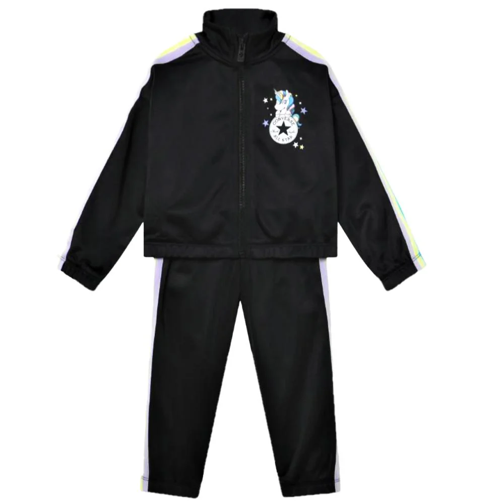 Tuta CONVERSE in acetato a fantasia unicorno con bande laterali multicolor e e logo stampato frontalmente inserti elastici.