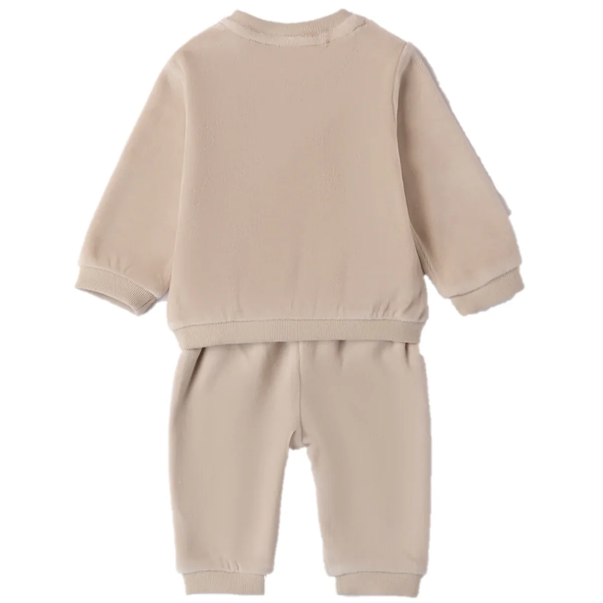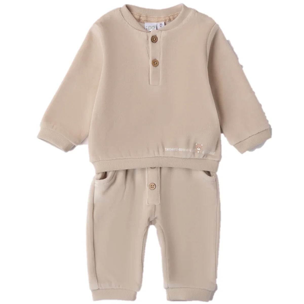 Tuta i DO in ciniglia composta da felpa e pantalone con rifiniture a contrasto e stampa.