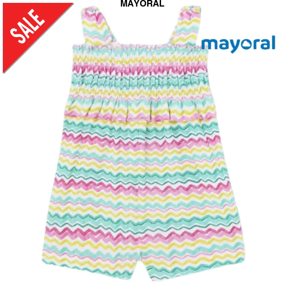 Tuta MAYORAL in cotone a fantasia con finto nodo applicato alle bretelle, parte superiore elastica per una comoda vestibilità, chiusura con clips.