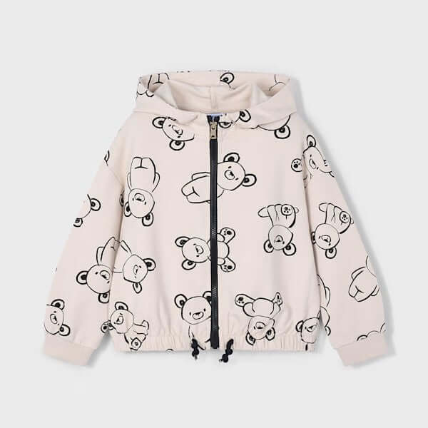 Tuta MAYORAL felpa e 2 pantaloni. Felpa a fantasia orsi con cappuccio e chiusura con zip , pantalone nero modello palazzo e pantalone panna mdello tuta.