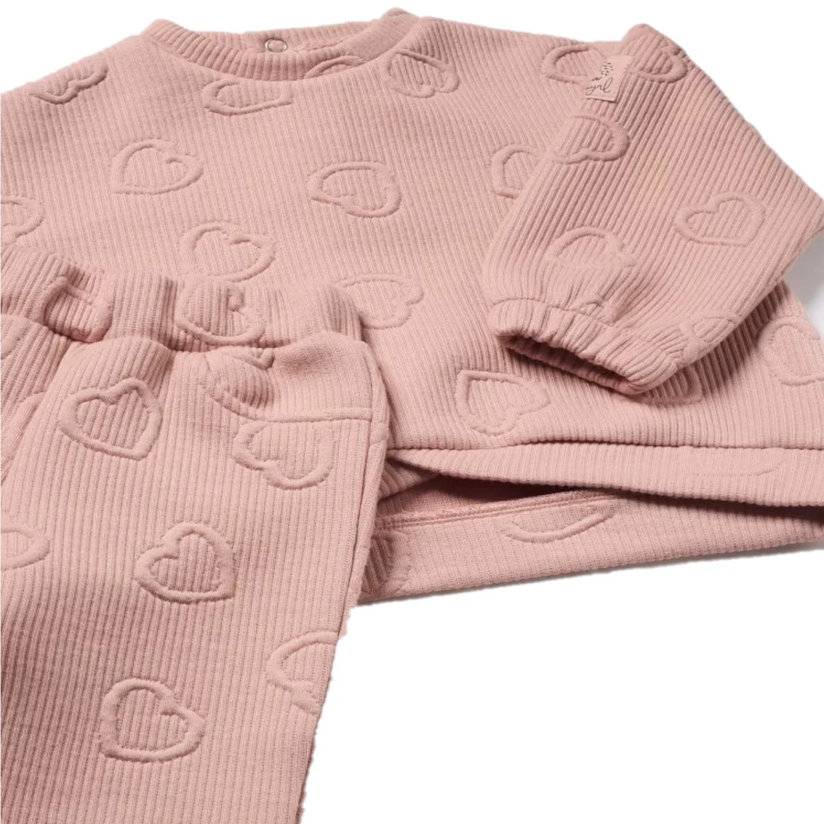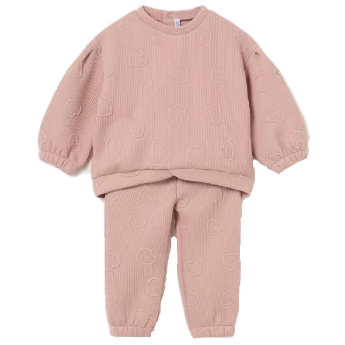 Tuta MAYORAL in tessuto a fantasia ricamata con felpa con polsini elastici, chiusura clips sul retro, e pantalone con elastico in vita e alle caviglie.