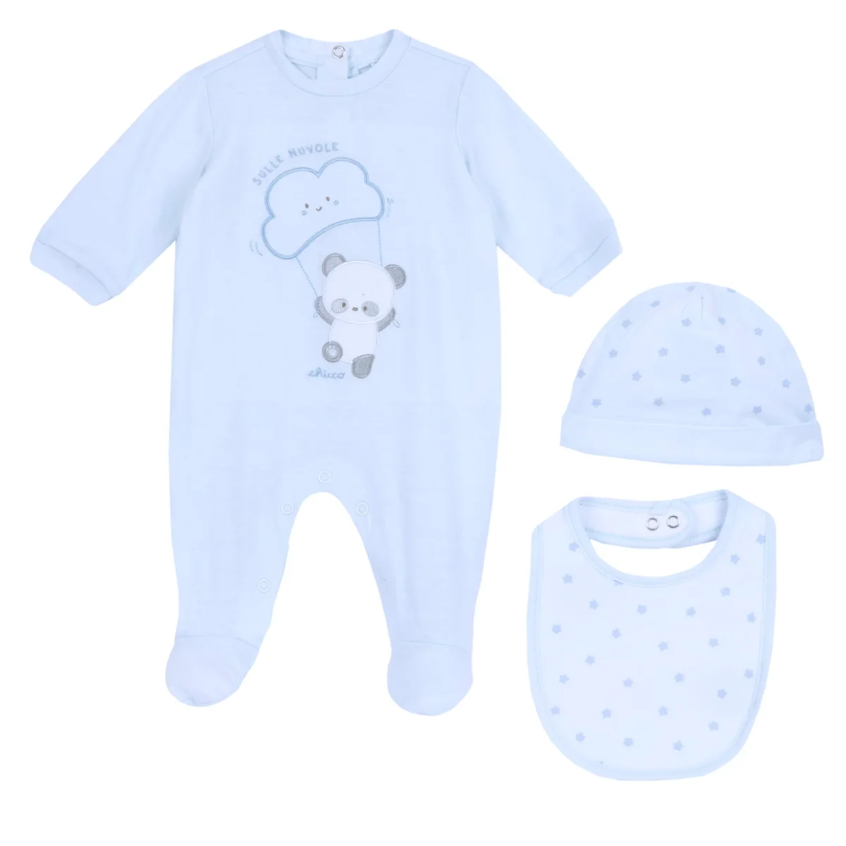 Tutina CHICCO in cotone con patch e ricami applicati, chiusura con clips, logo ricamato applicato; cappello in cotone a fantasia stelline; bavetta in cotone a fantasia, retro in spugna, chiusura con clips.
