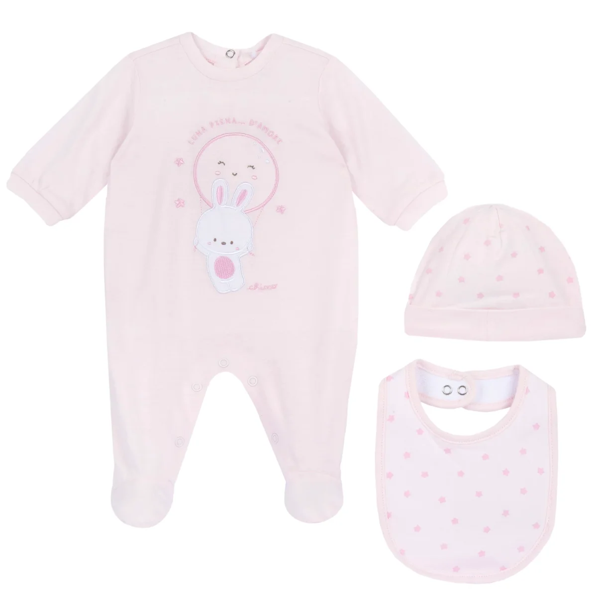Tutina CHICCO in cotone con patch e ricami applicati, chiusura con clips, logo ricamato applicato; cappello in cotone a fantasia stelline; bavetta in cotone a fantasia, retro in spugna, chiusura con clips.