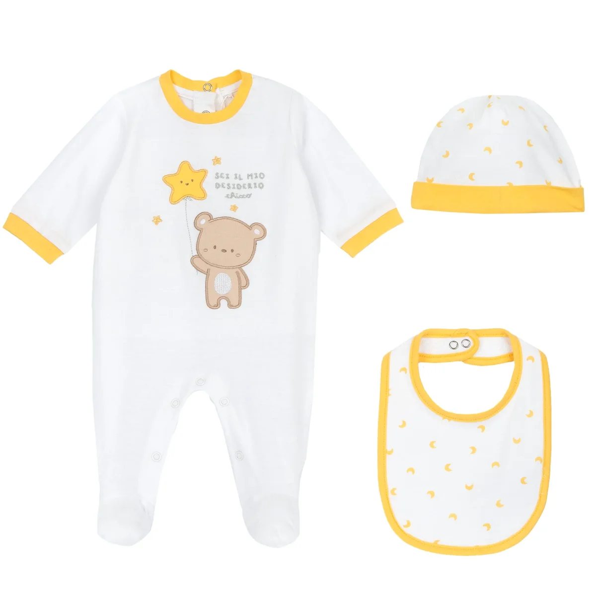 Tutina CHICCO in cotone con patch e ricami applicati, chiusura con clips, logo ricamato applicato; cappello in cotone a fantasia stelline; bavetta in cotone a fantasia, retro in spugna, chiusura con clips.