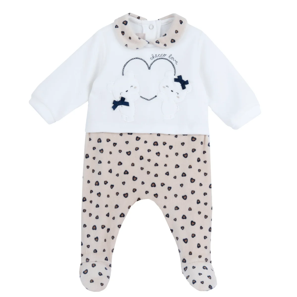 Tutina CHICCO in morbida ciniglia a fantasia in colori a contrasto, colletto, ricami, patch e fiocchetti applicati, logo ricamato applicato, chiusura con clips sul retro.