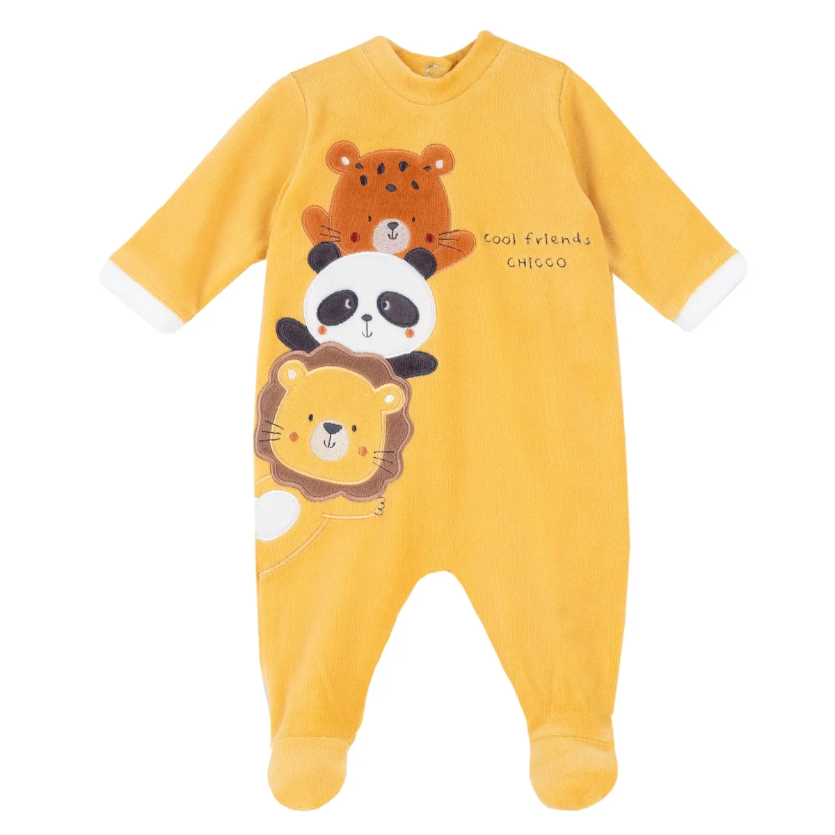 Tutina CHICCO in ciniglia con patch animali applicati, ricami a contrasto, chiusura clips sul retro.