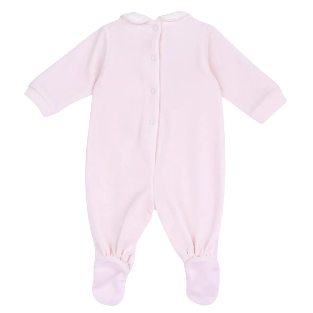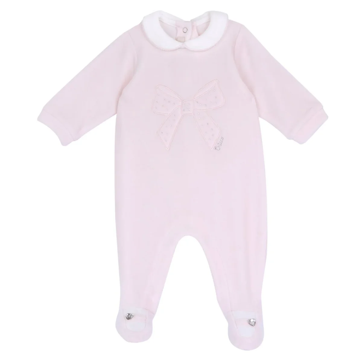 Tutina CHICCO in ciniglia , grafica con applicazioni di strass ricoperte con tulle. Piedino effetto scarpina ricamata e bottone gioiello..