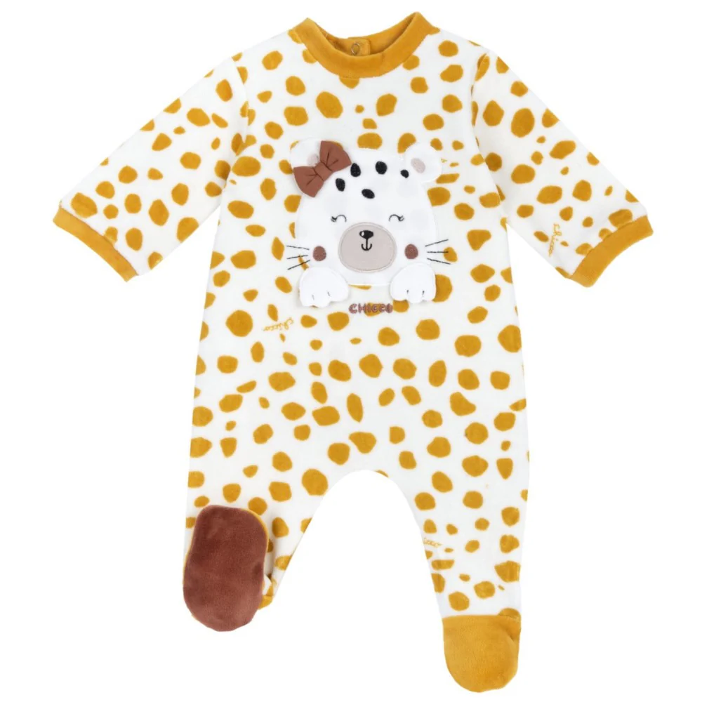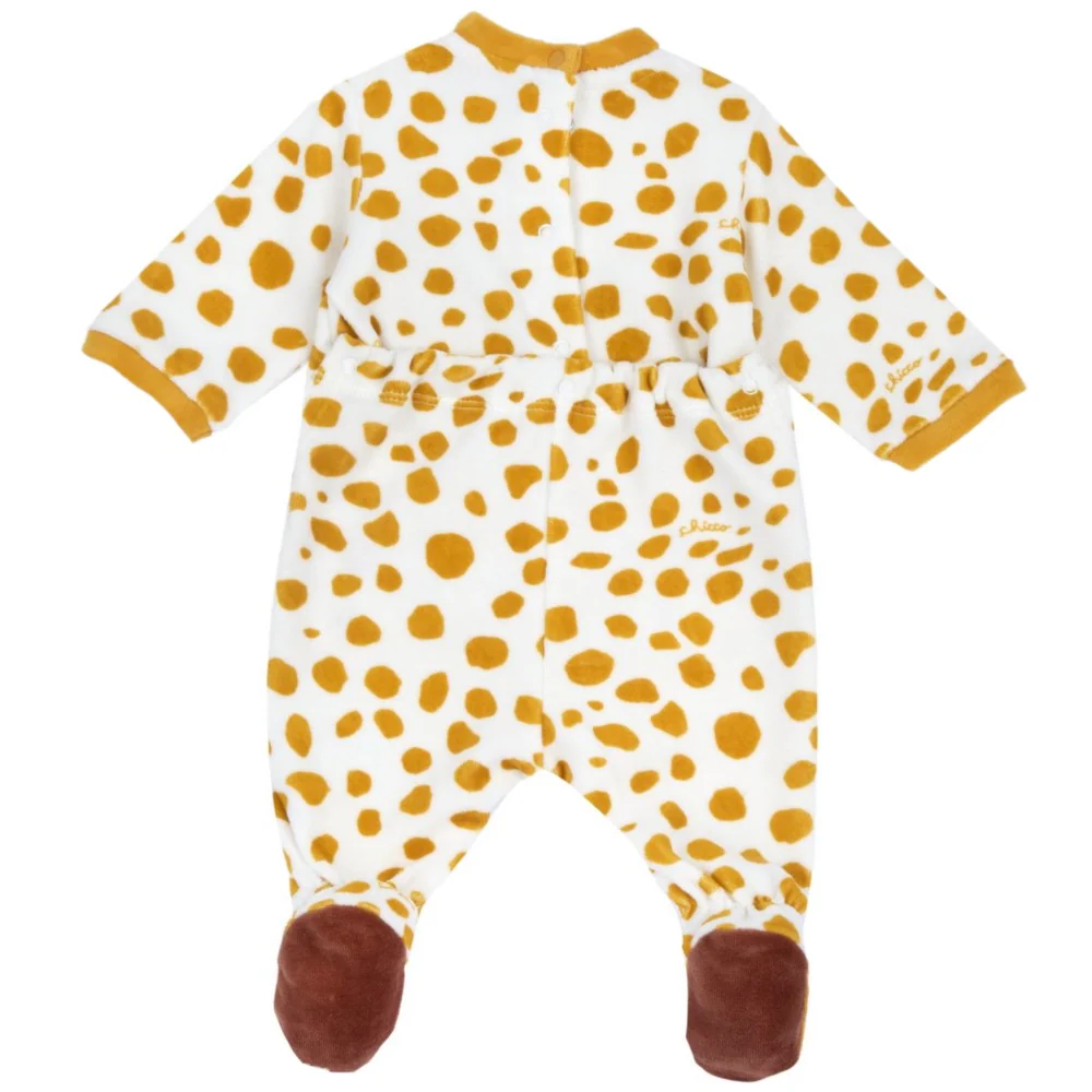 Tutina CHICCO in ciniglia fantasia animalier con patch applicato logo stampato a contrasto chiusura clips sul retro.