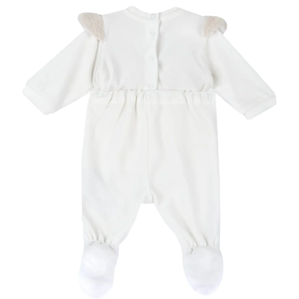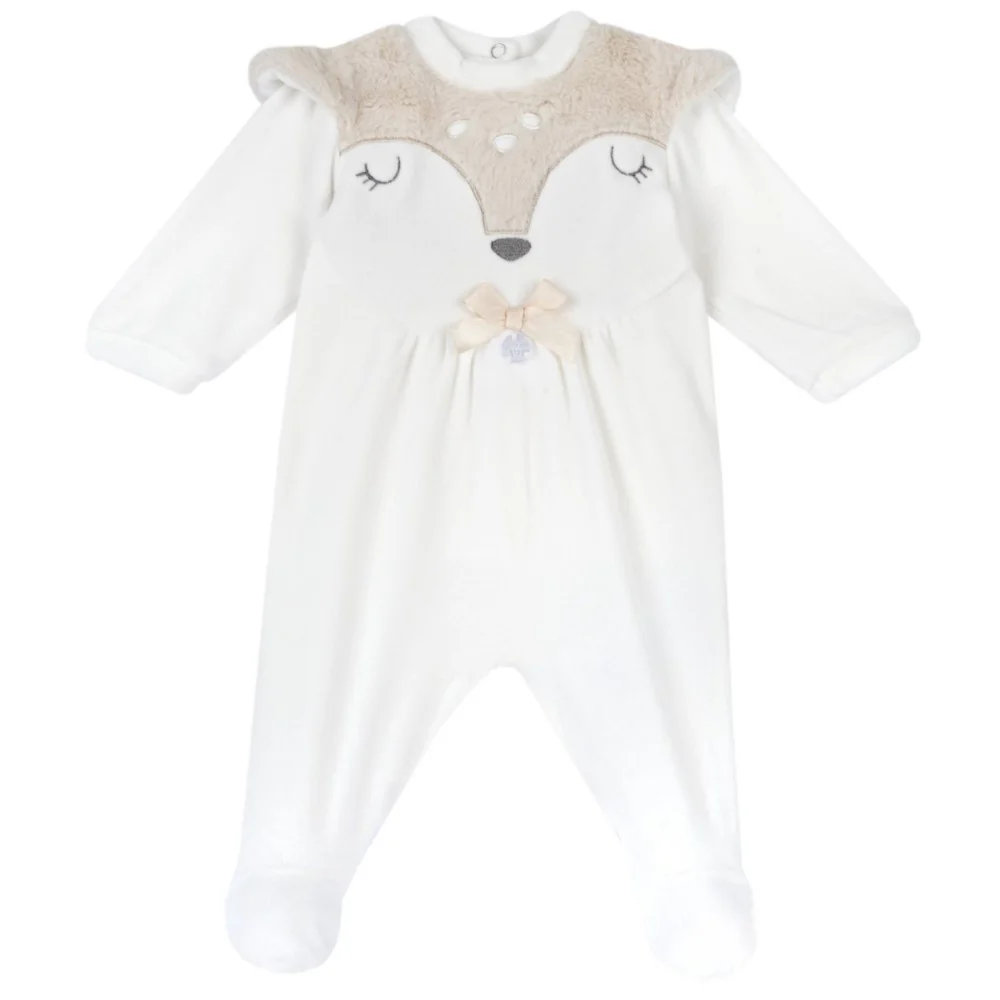 Tutina CHICCO in ciniglia girocollo con morbido tessuto applicato fiocco in raso applicato chiusura clips sul retro.