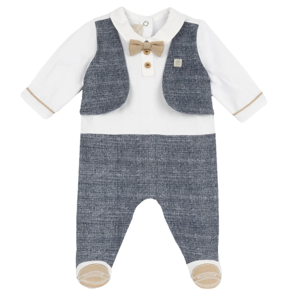 Tutina CHICCO in cotone con finto gilet e bottoncini applicati chiusura con clips sul retro chiusura con clips ai polsini papillon removibile mediante bottoncini logo applicato a rilievo.