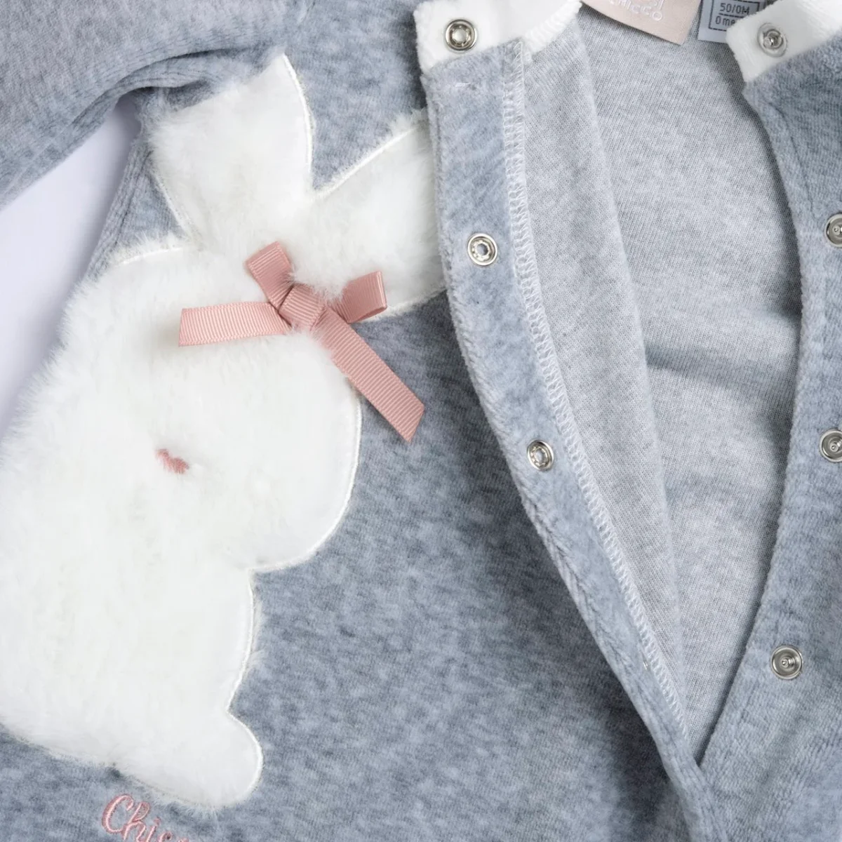 Tutina CHICCO in ciniglia chiusura con clips nella parte anteriore , patch coniglietto in morbido tessuto , fiocco rosa applicato.
