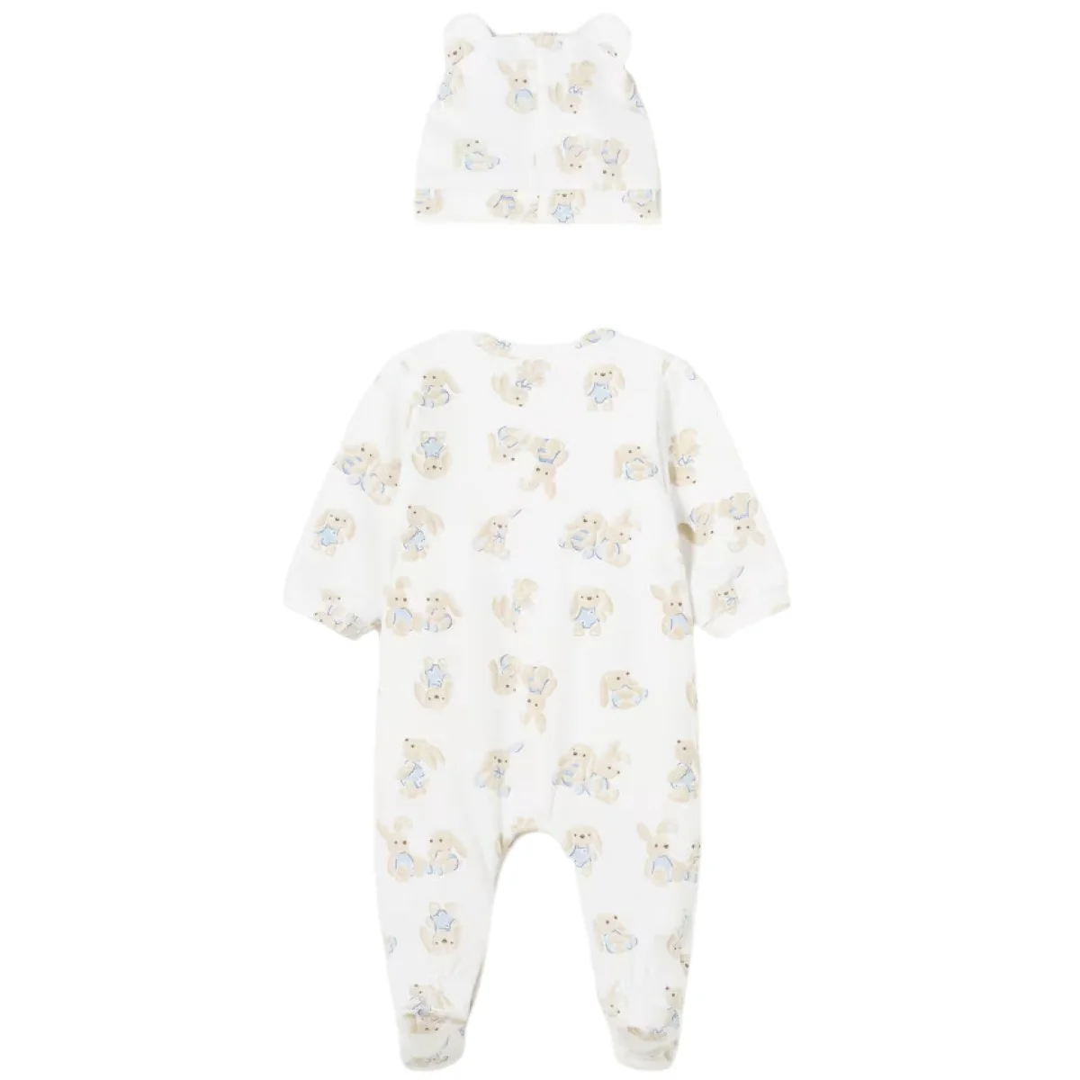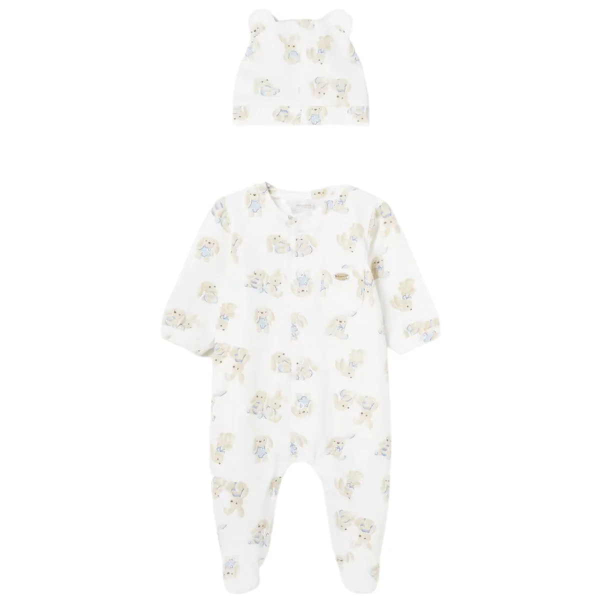 Tutina MAYORAL in cotone a fantasia in colori a contrasto, chiusura con clips, cappello in cotone a fantasia in coordinato.