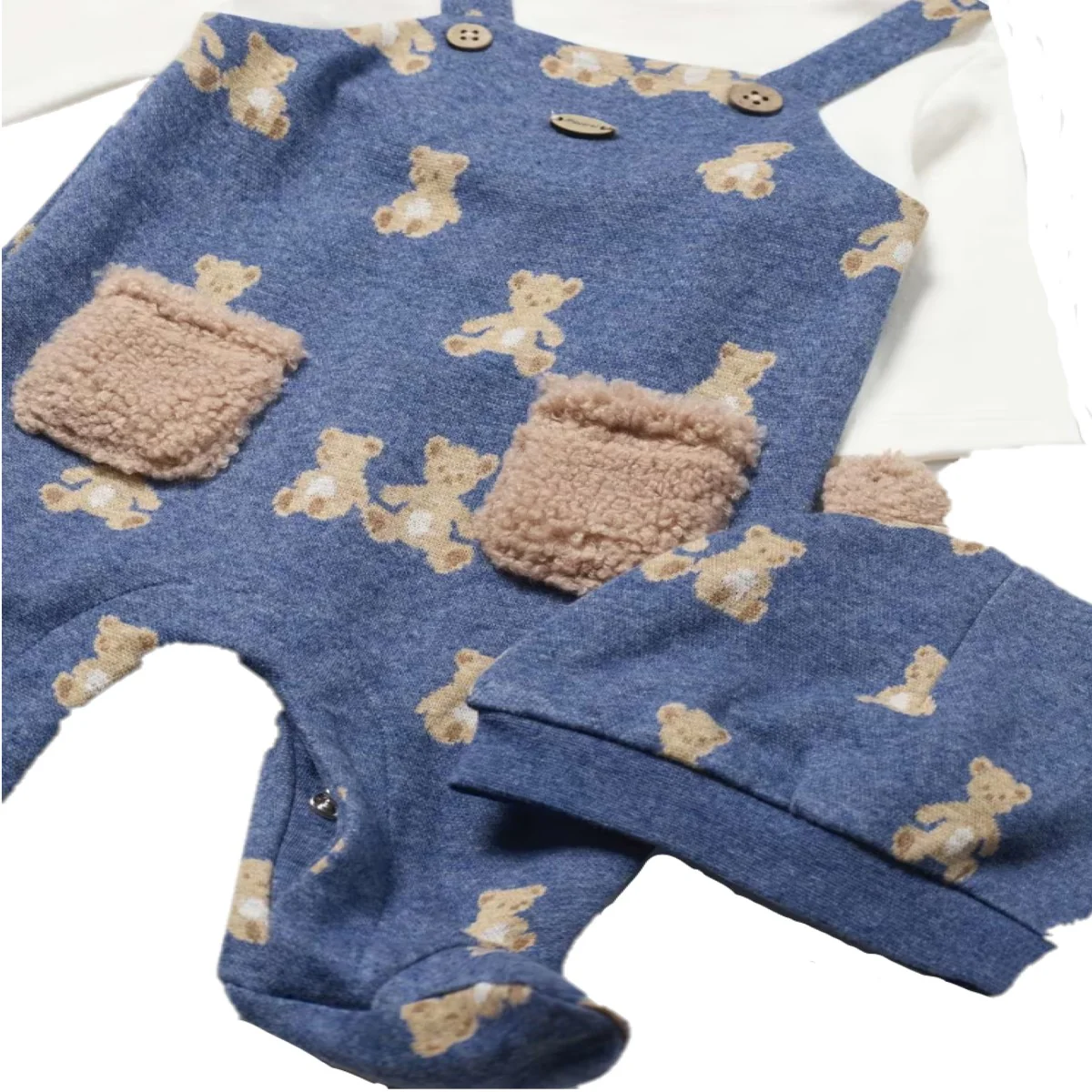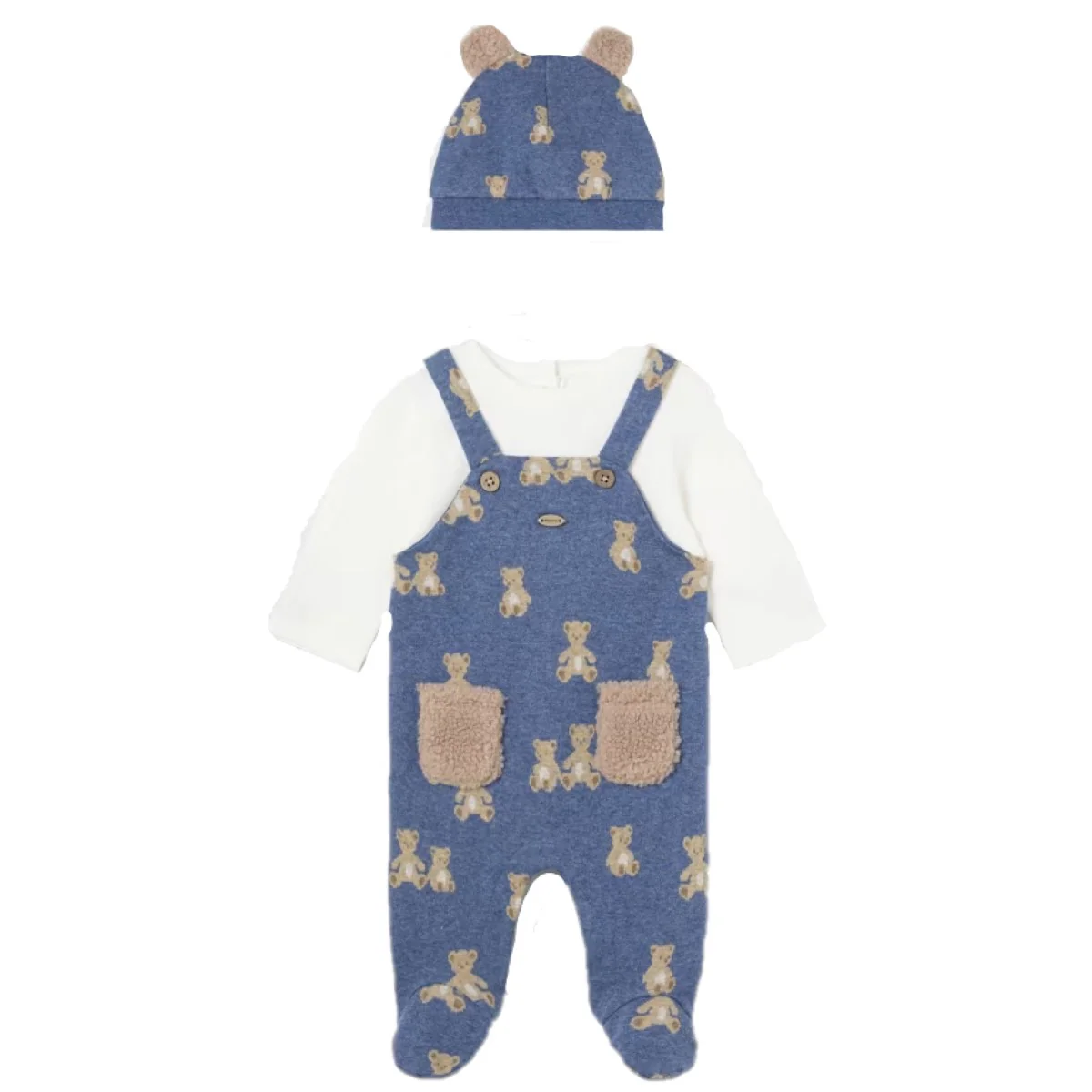 Tutina MAYORAL modello finta salopette a fantasia orsetti, finti bottoncini applicati, logo applicato a rilievo, tasche in tessuto teddy, chiusura con clips sul retro; in coordinato cappellino a fantasia orsetti con orecchie applicate in tessuto teddy.