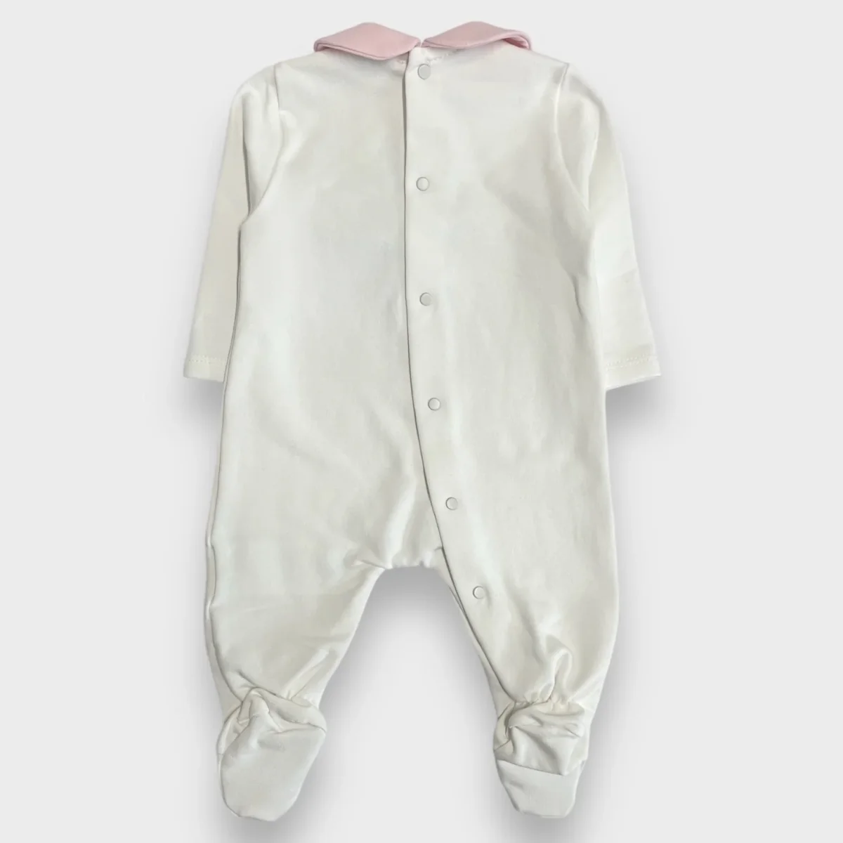 Tutina LE BEBE’ in felpa con interno felpato, stampa orsetto a contrasto, fiocco applicato e colletto in colore a contrasto. apertura con clips sul retro.