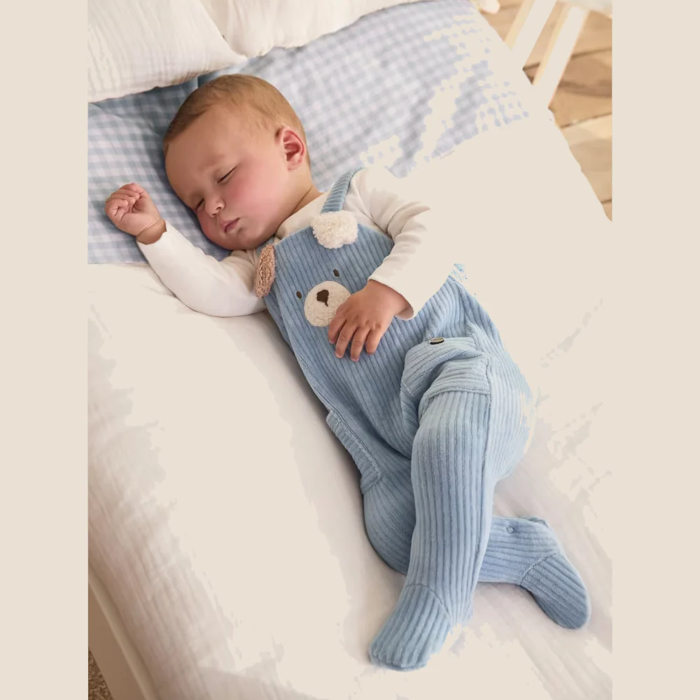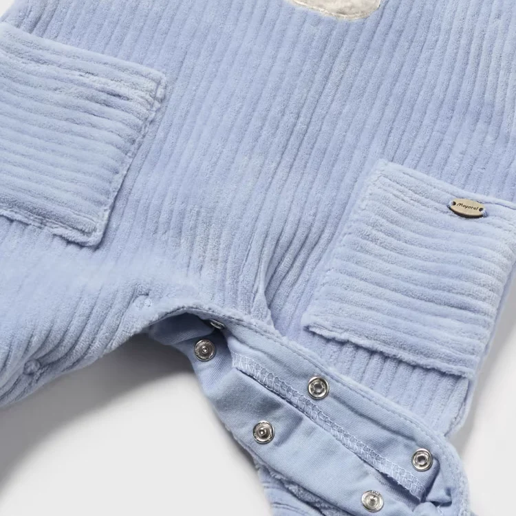 Tutina neonato MAYORAL in velluto a costine, applicazione a contrasto, apertura con clips. Dalla taglia 6/9 in poi è senza piedini.