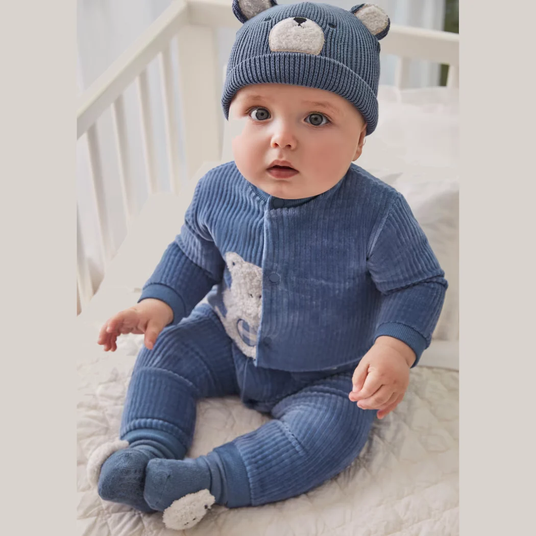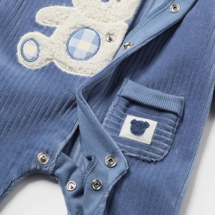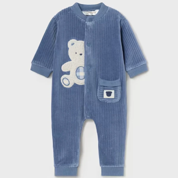 Tutina neonato MAYORAL in ciniglia a costine, con orsetto a contrasto, apertura con clips.