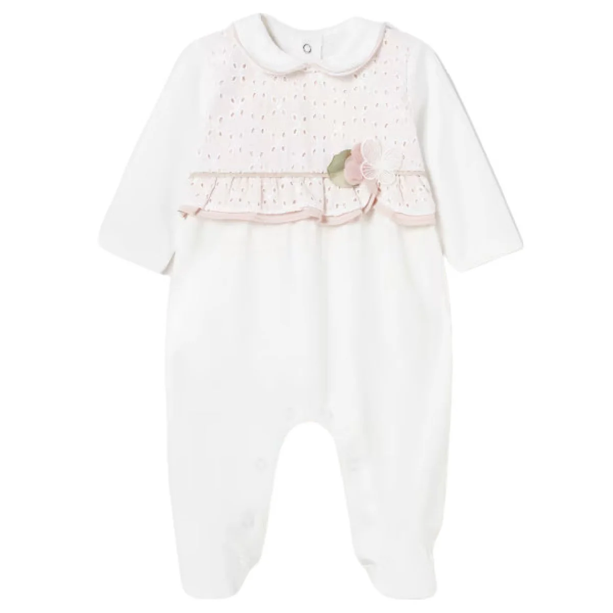 Tutina MAYORAL in cotone con parte superiore in colore a contrasto e ricami applicati, chiusura clips , applicazioni in tessuto e colori a contrasto.