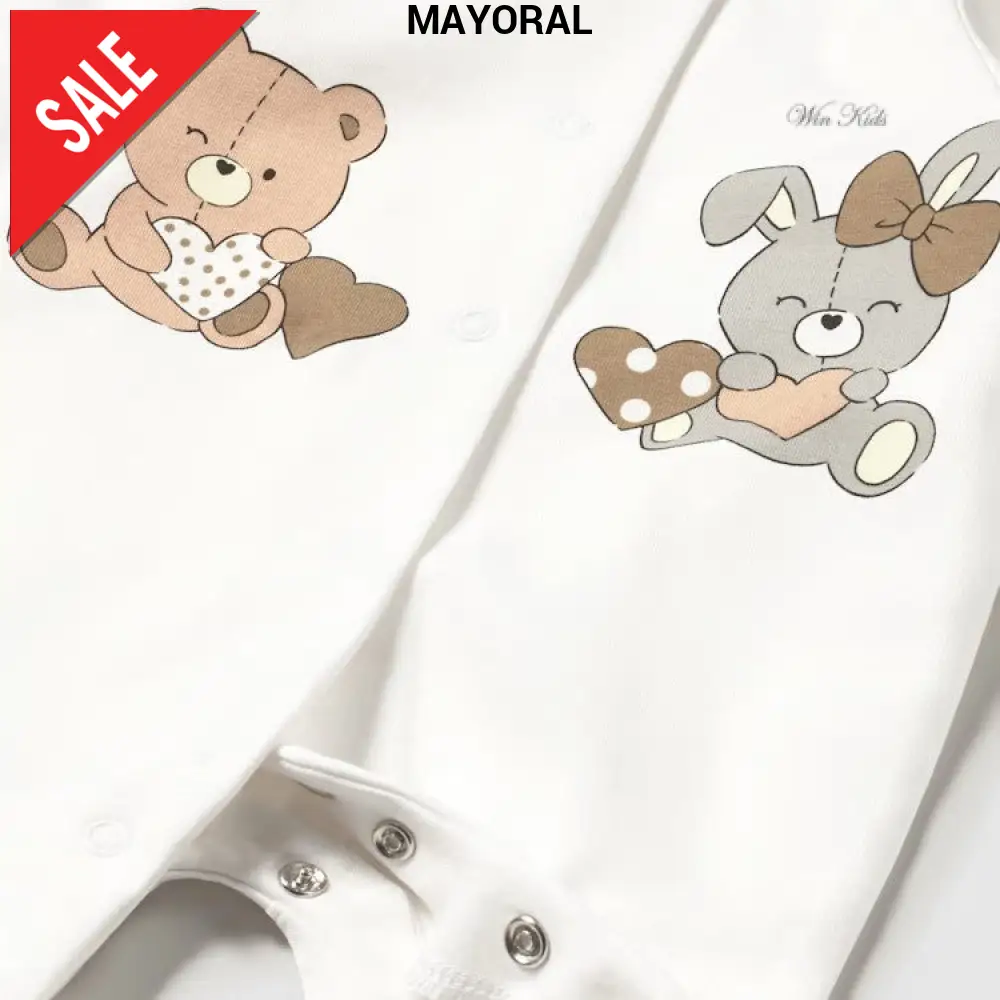 Tutine MAYORAL in cotone con chiusura con clips sul davanti , uno in tessuto a fantasia orsetti e l altra con orsetta e coniglietta spampate.