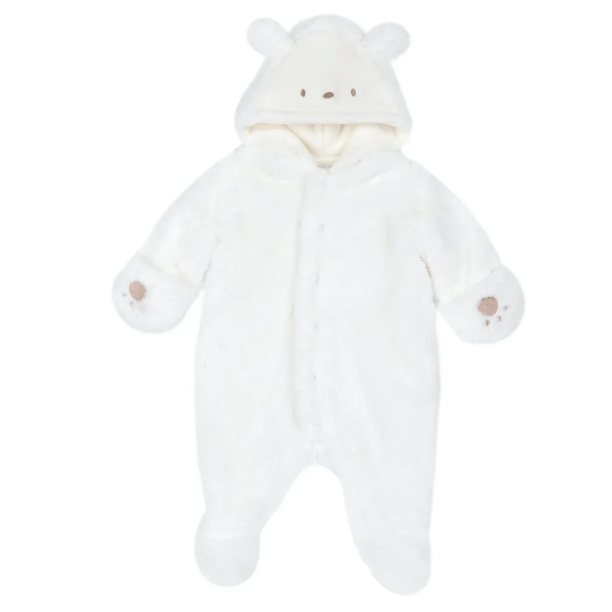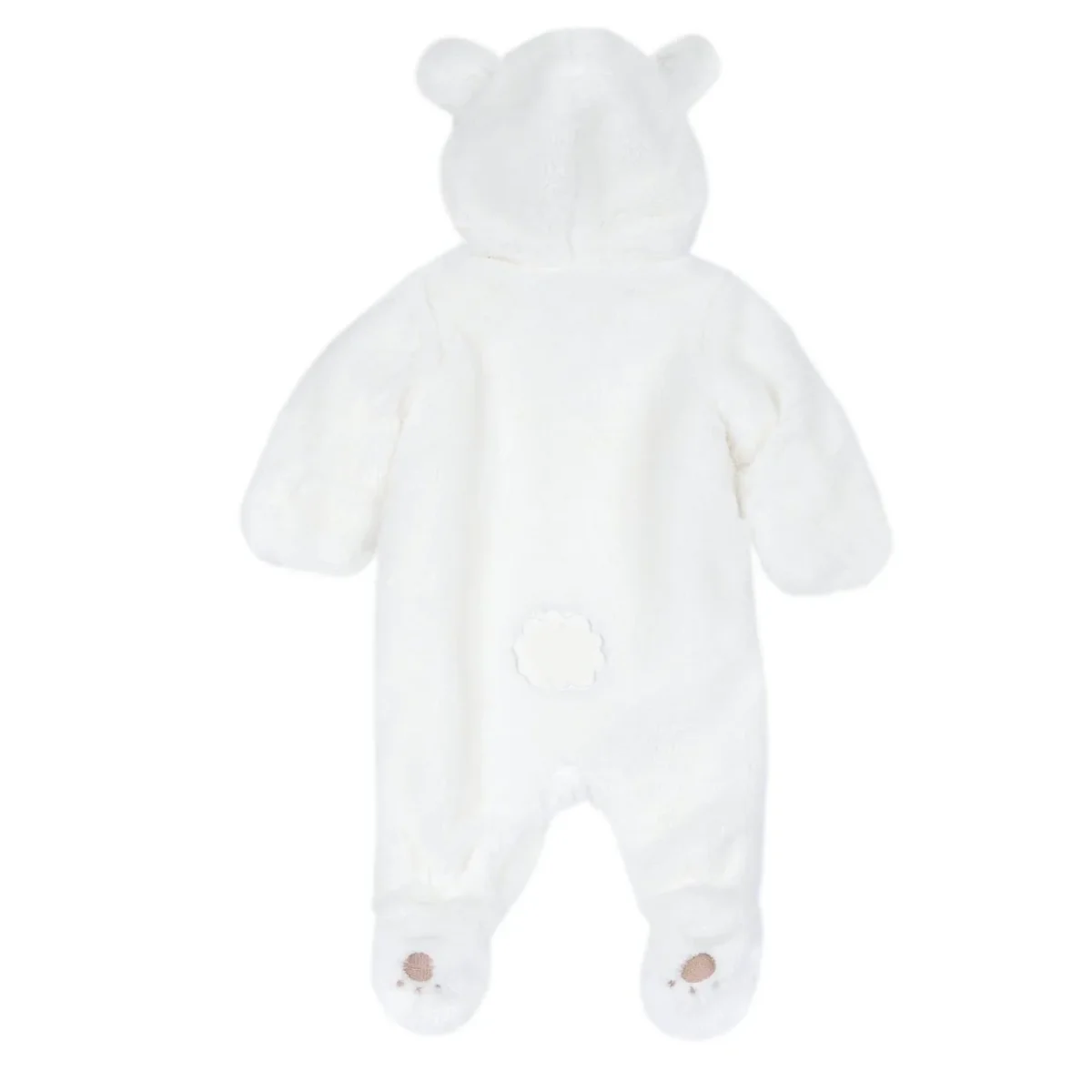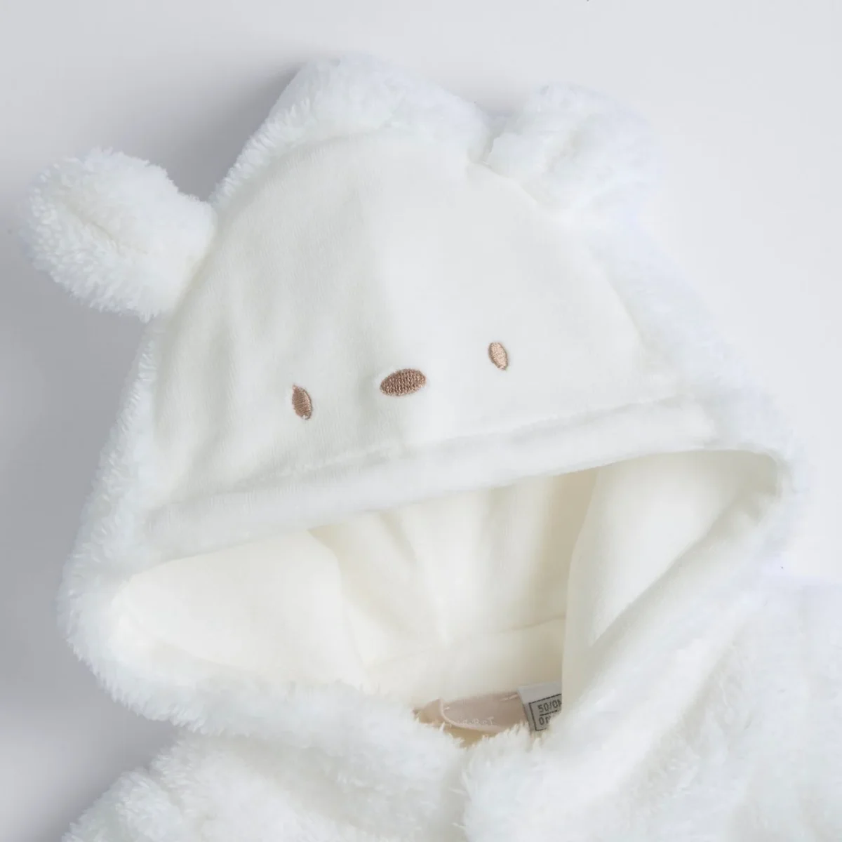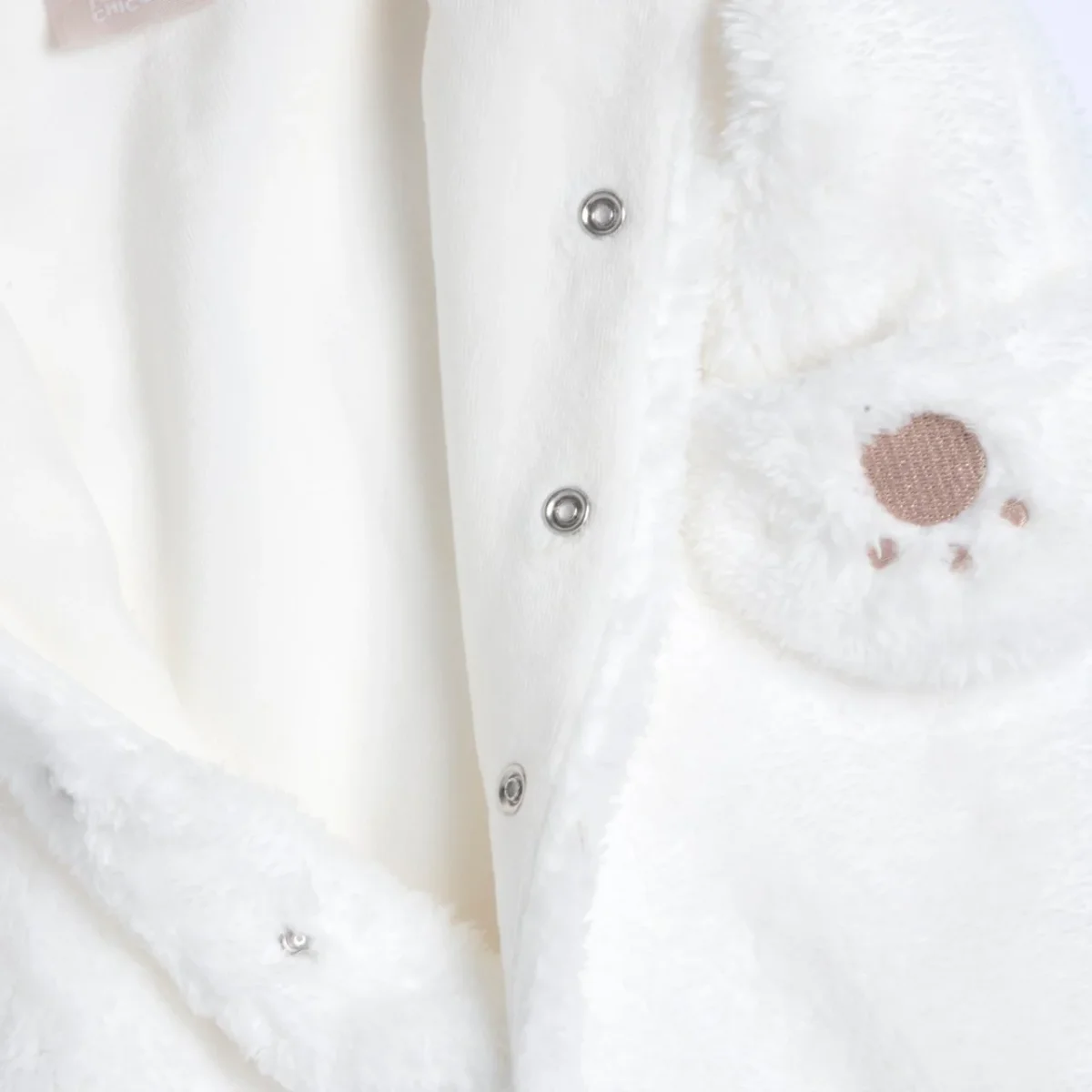 Tutone modello eschimo morbido in morbido tessuto , interno in ciniglia , chiusura con clips . Ricamo sul cappuccio e orecchie applicate . Polso risvoltabile copri manine . Prodotto con Certificazione Oeko-Tex: la qualità per il tuo bambino.