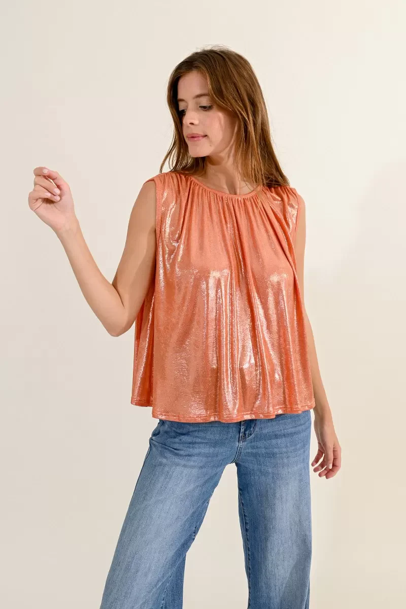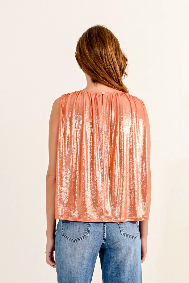 Top in particolare tessuto spalmato cangiante. Scollo tondo con lavorazione a pieghe su tutta la lunghezza. Vestibilità molto ampia. Taglia in foto S. Composizione tessuto 95% poliestere 5% elastan.