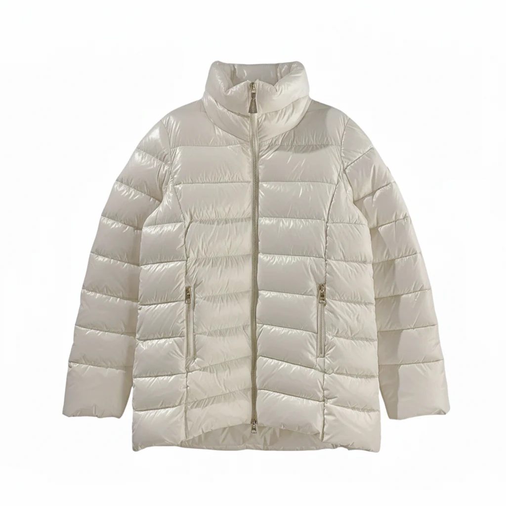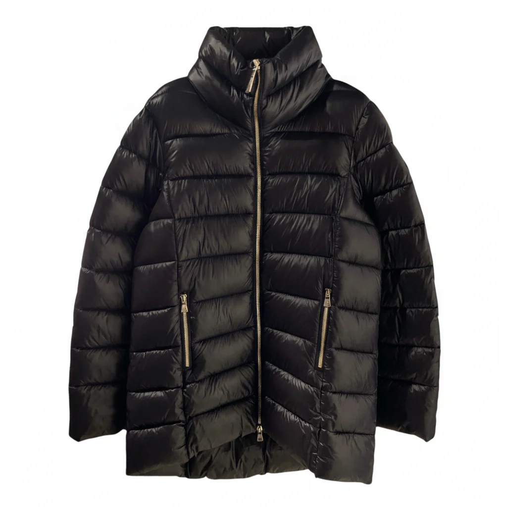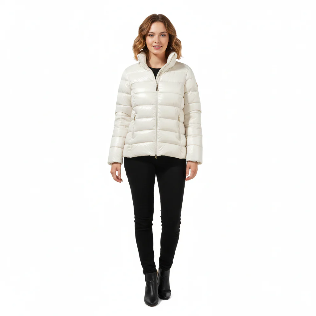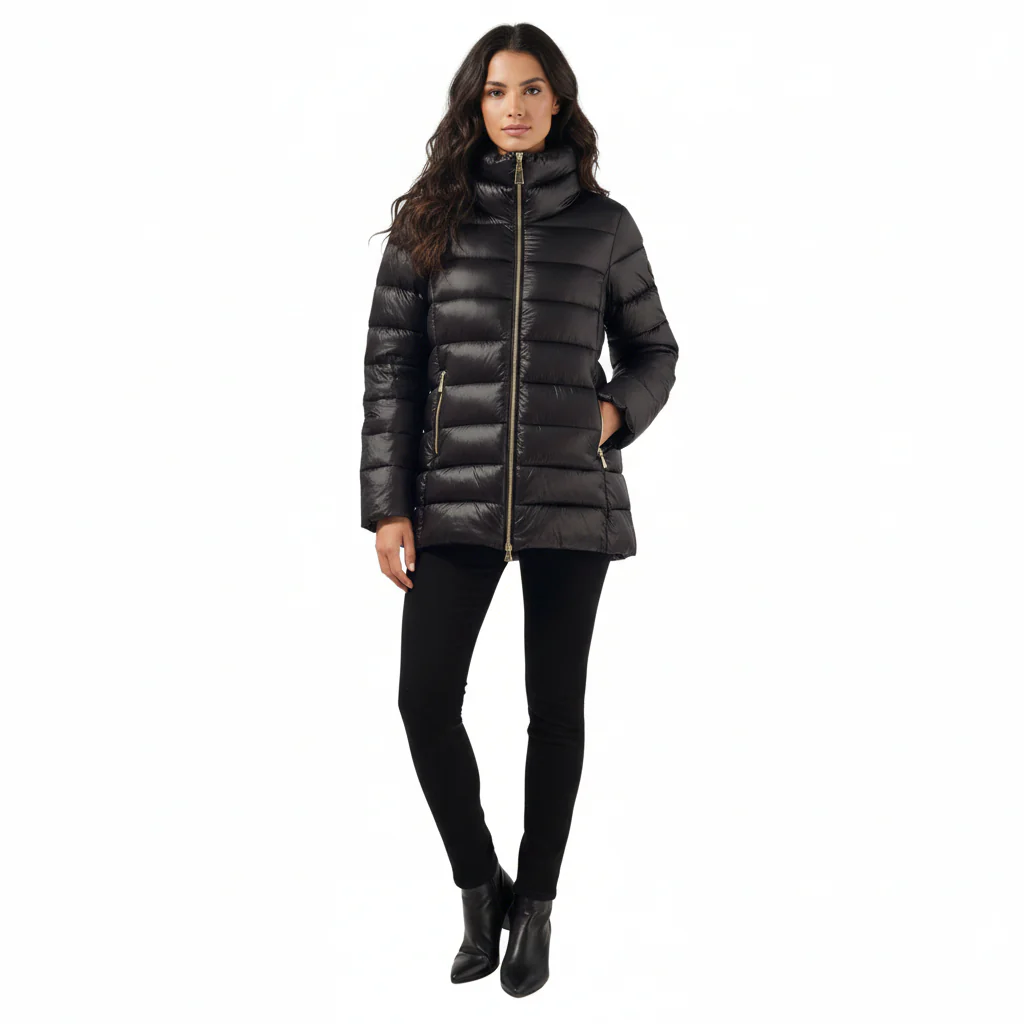 Piumino donna lunghezza midi. Collo a pistagna morbido, chiusura centrale con zip. Tasche laterali chiuse da zip. Maniche lunghe, fondo stondato. Tessuto lucido lavorazione matelassè. Composizione tessuto 100% nylon, imbottitura 100% poliestere (piuma ecologica).