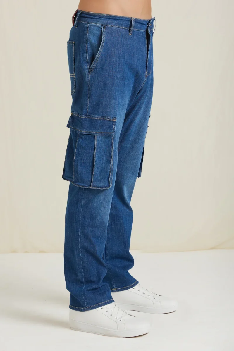 Jeans comfort fit modello cargo in denim di cotone elasticizzato. Vita regolare, 5 tasche, chiusura con zip e bottone. Gamba e fondo dritti, tasconi applicati su entrambe le gambe. Vestibilità comoda. Composizione tessuto 98% cotone 2% elastan.