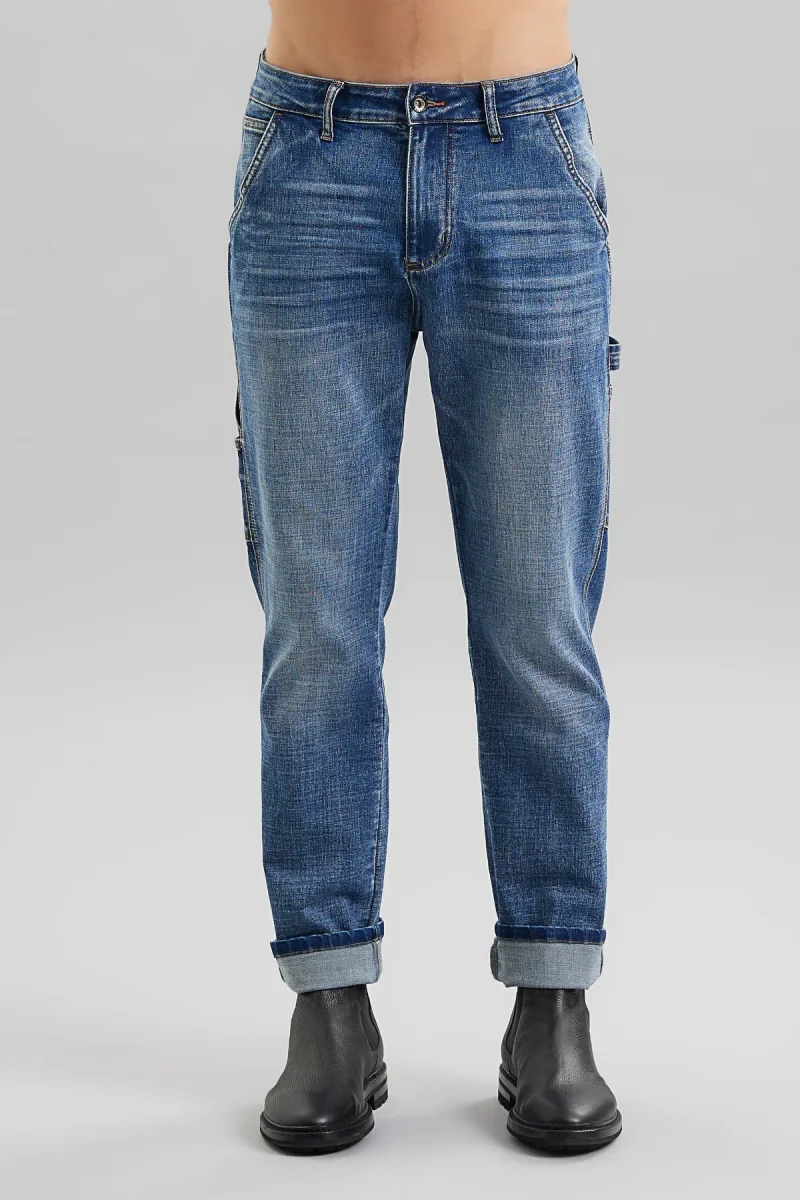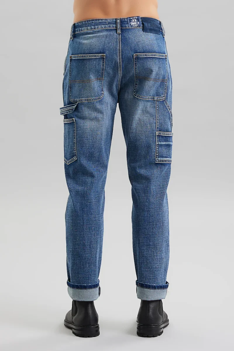 Jeans uomo modello work in denim elasticizzato. Vita regolare, chiusura con zip e bottone. Tasche a filo laterali, tasche posteriori e tasconi applicati con dettagli work sulle gambe. Vestibilità comoda dritta. Taglia in foto 31. Composizione tessuto 98% cotone 2% elastan.