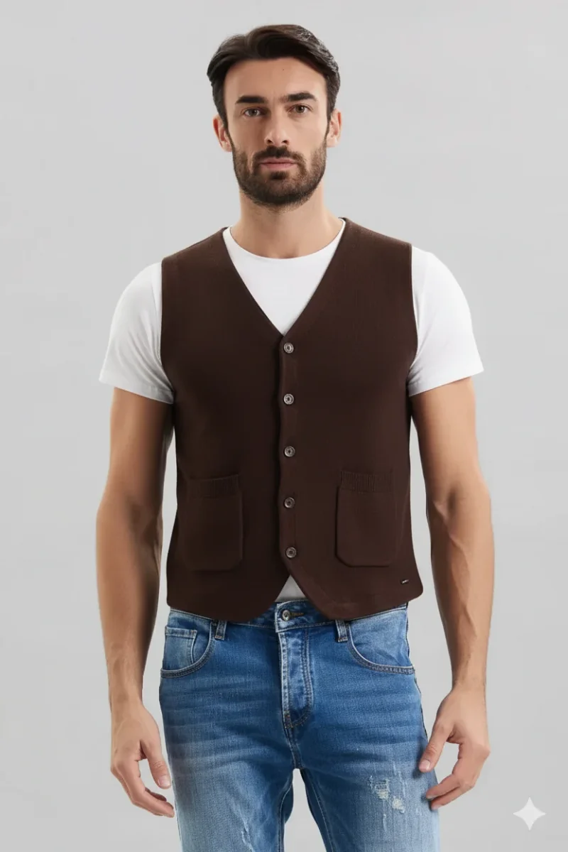 Gilet in maglia elasticizzata misto viscosa. Scollo a punta, chiusura con bottoni in tinta. Taschine applicate sul davanti, fondo stondato. Vestibilità regolare. Composizione tessuto 80% viscosa 20% nylon