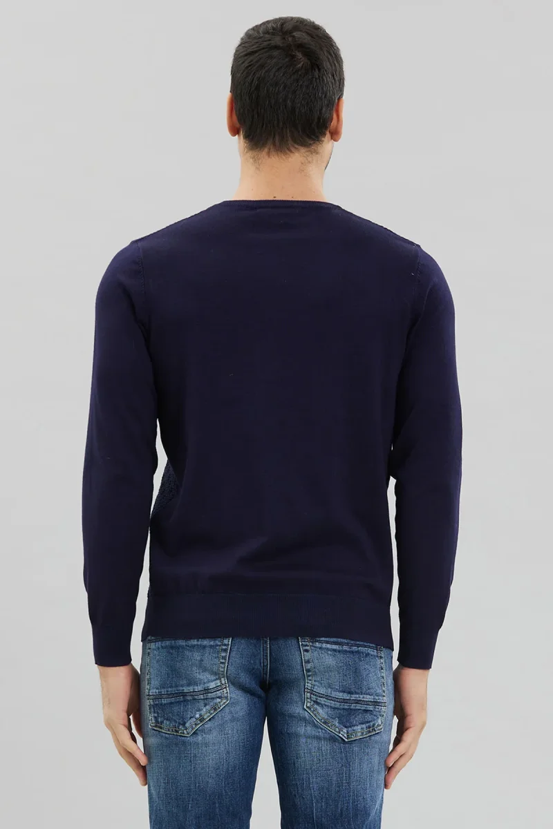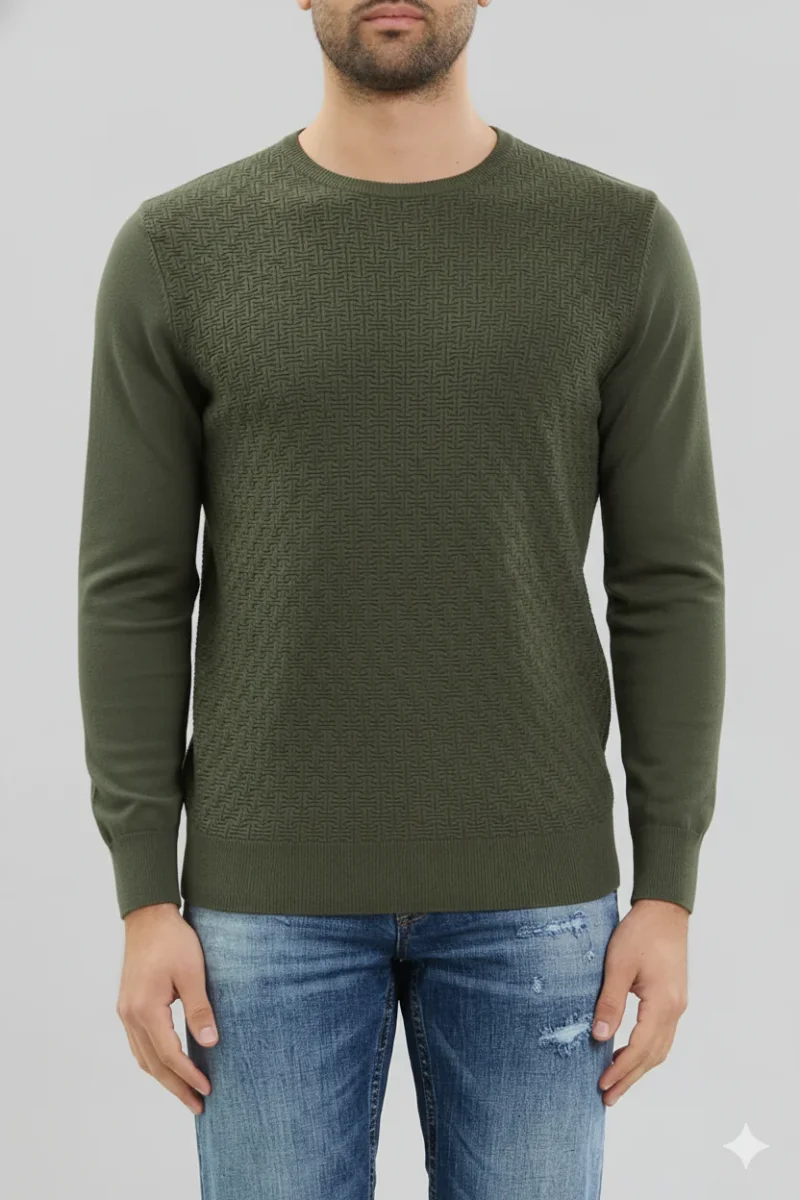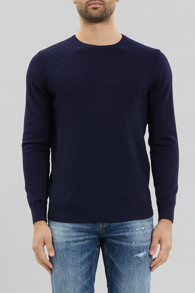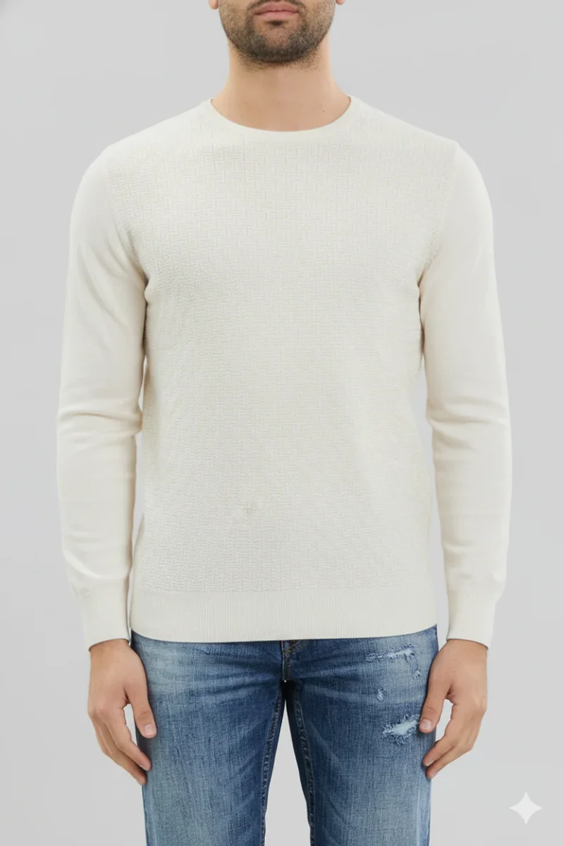 Maglia uomo girocollo in tessuto misto viscosa motivo operato. Girocollo regolare, bordi rifiniti a costine. Maniche lunghe lisce, lavorazione geometrica sul davanti. Vestibilità regolare. Tessuto 80% viscosa 20% nylon.