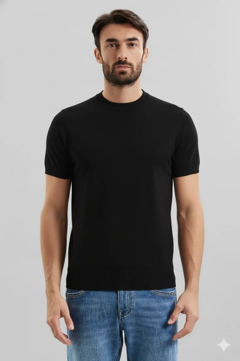 Maglia uomo modello t-shirt in tessuto elasticizzato misto viscosa. Girocollo regolare, bordi rifiniti a costine. Maniche corte, logo brand cucito sul lato. Vestibilità regolare. Tessuto 80% viscosa 20% nylon