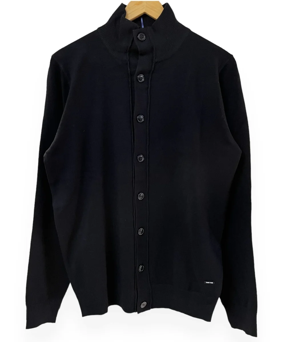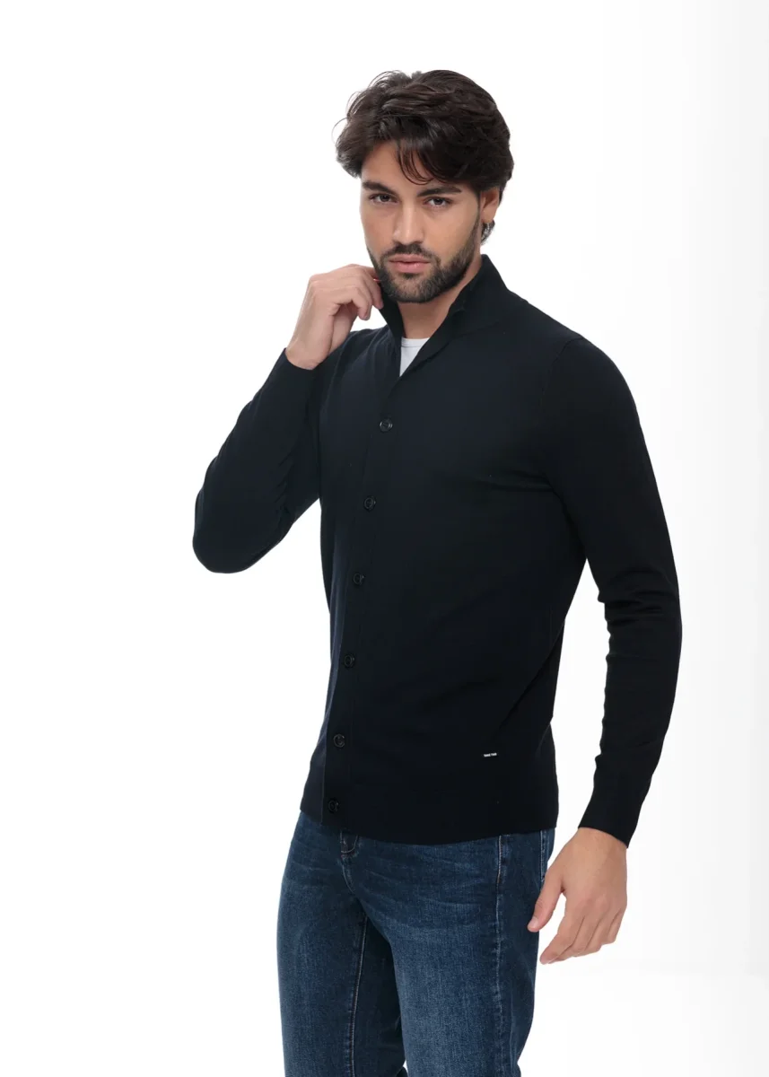 Cardigan basico in tessuto elasticizzato misto viscosa. Collo lupetto rifinito a canaletti, chiusura centrale con bottoni in tinta su pattina con doppio bordo laterale. Fondo e polsini rifiniti a costine. Vestibilit regolare. Composizione tessuto 80% viscosa 20% nylon.