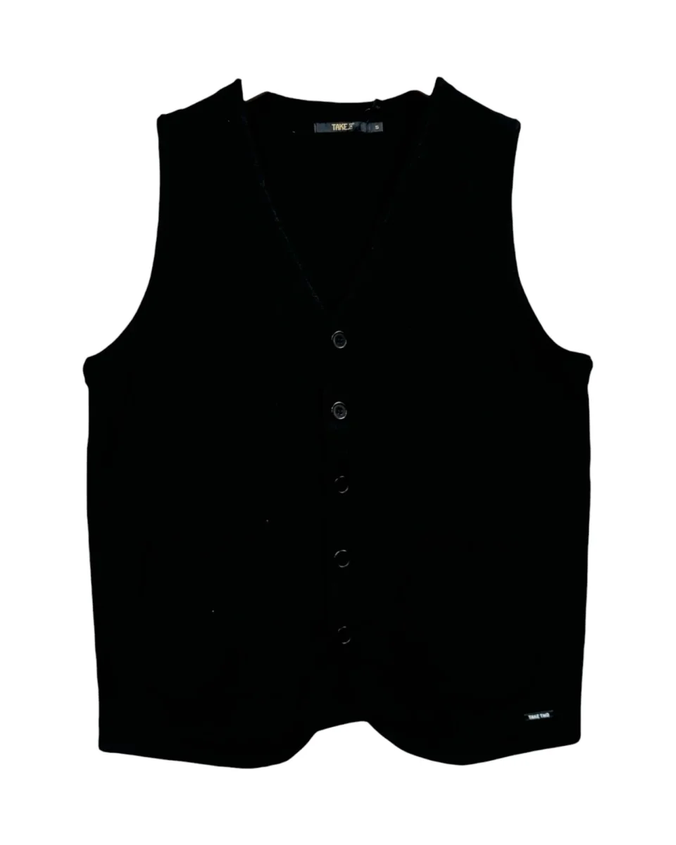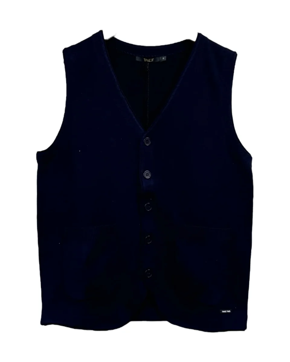 Gilet modello panciotto in tessuto misto viscosa. Scollo a punta, chiusura con bottoni in tinta, tasche applicate sul davanti. Fondo stondato, logo brand sul fondo. Vestibilità slim. Composizione tessuto 80% viscosa 20% nylon.
