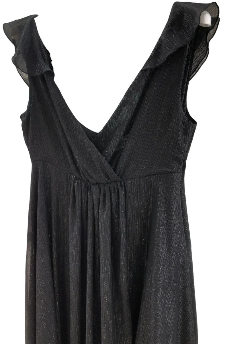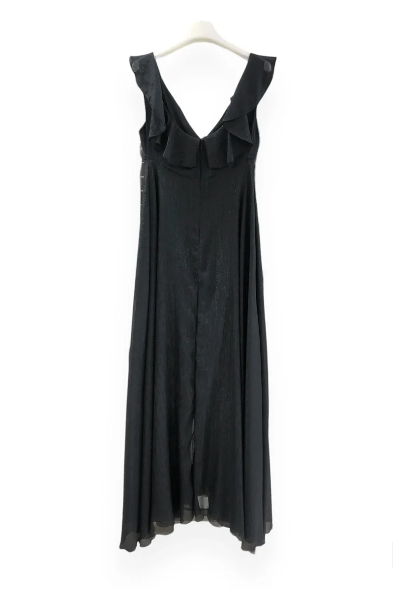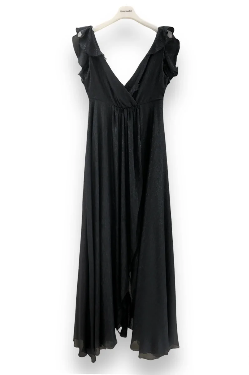 Vestito lungo in tessuto georgette con inserti lurex. Scollo profondo a V accavallato e arriccio in vita, dettagli rouches sulle spalle. Gonna lunga dalla linea morbida con finto incrocio e minigonna in tinta. Zip a scomparsa sulla schiena. La modella indossa la taglia 40. Composizione 100% poliestere.