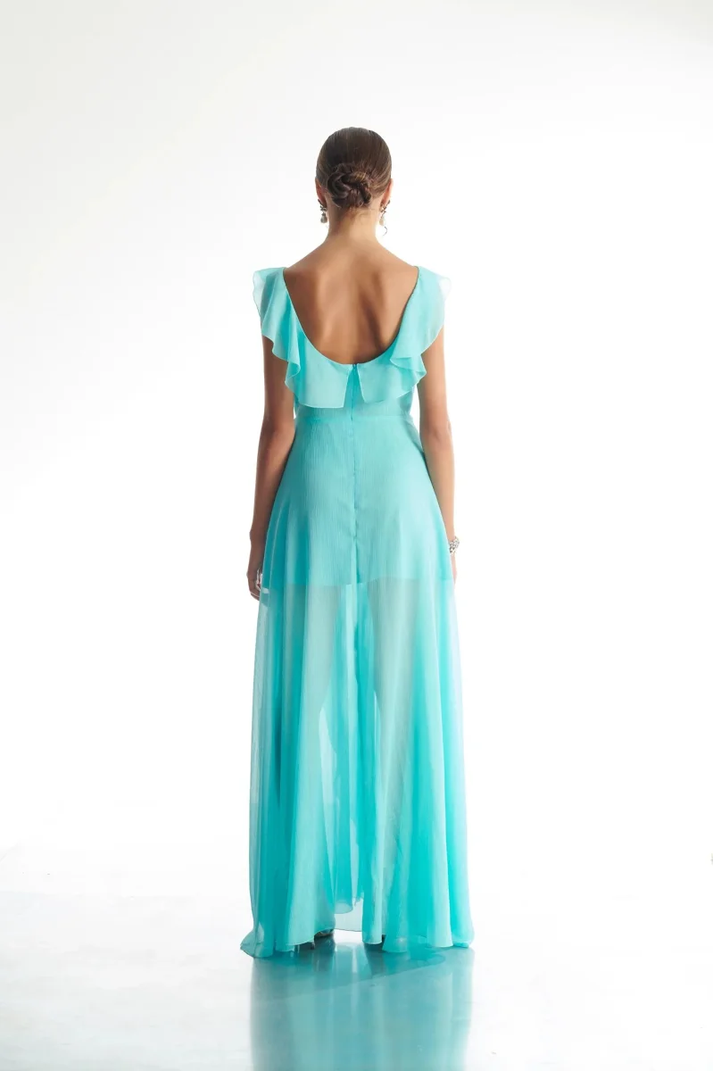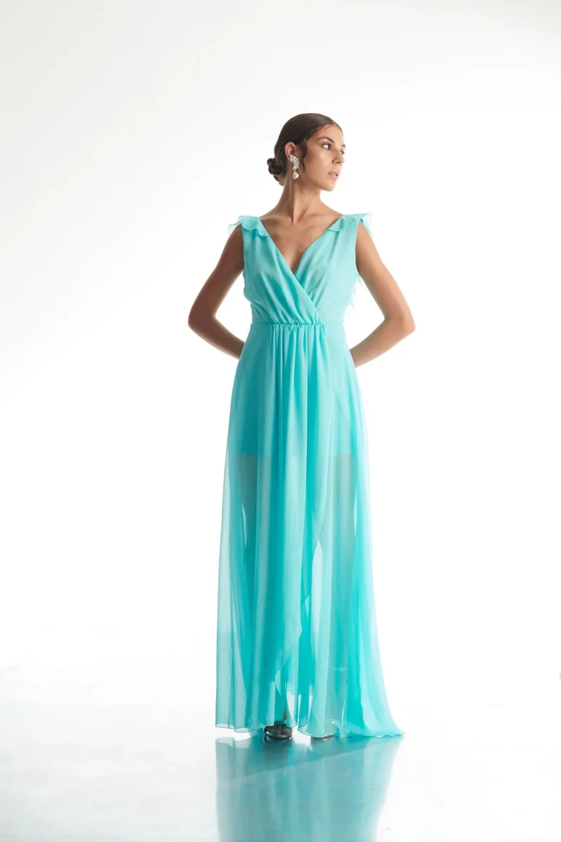 Vestito lungo in tessuto georgette con inserti lurex. Scollo profondo a V accavallato e arriccio in vita, dettagli rouches sulle spalle. Gonna lunga dalla linea morbida con finto incrocio e minigonna in tinta. Zip a scomparsa sulla schiena. La modella indossa la taglia 40. Composizione 100% poliestere.