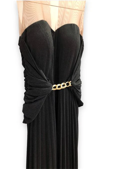 Vestito lungo elegante in tessuto lurex plissettato elasticizzato. Corpetto con scollo a cuore, coppe applicate, tessuto garza color carne sul collo e sulla schiena, chiusura con bottoncino sul collo e goccia profonda sul retro, chiusura con zip posteriore. Fascia arricciata sui fianchi unita al centro da dettaglio dorato. Gonna ampia plissettata. La modella indossa una taglia 40. Composizione tessuto 78% poliestere, 5% elastan, 1% nylon.