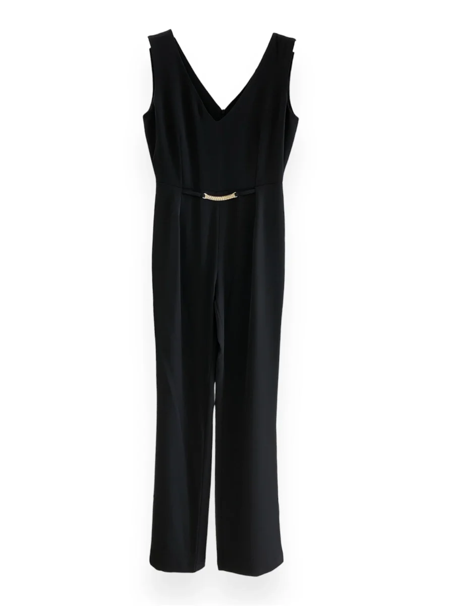 Tuta lunga elegante in morbido tessuto cady. Scollo a V, bustino morbido. Taglio in vita con dettaglio oro applicato al centro. Pantalone a vita alta con pences in vita, gamba slim e fondo dritto. Chiusura con a scomparsa sulla schiena. Taglia in foto 40. Composizione tessuto 95% poliestere 5% elastan.