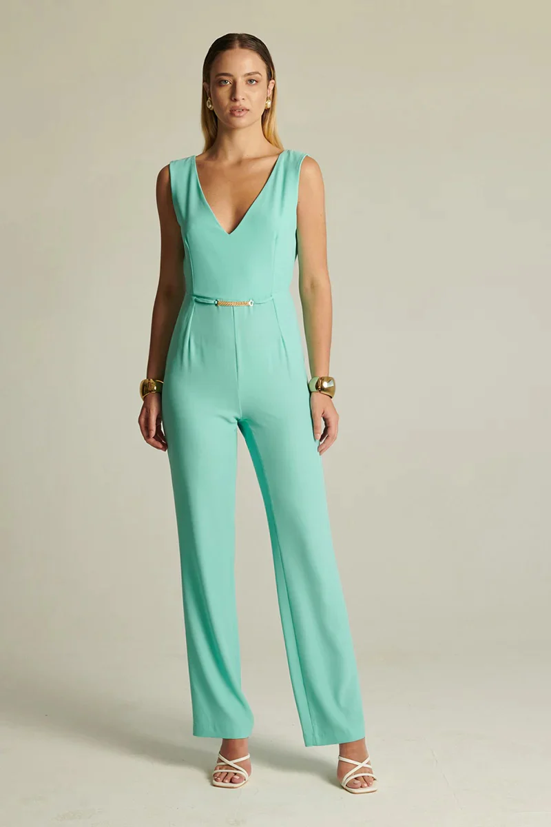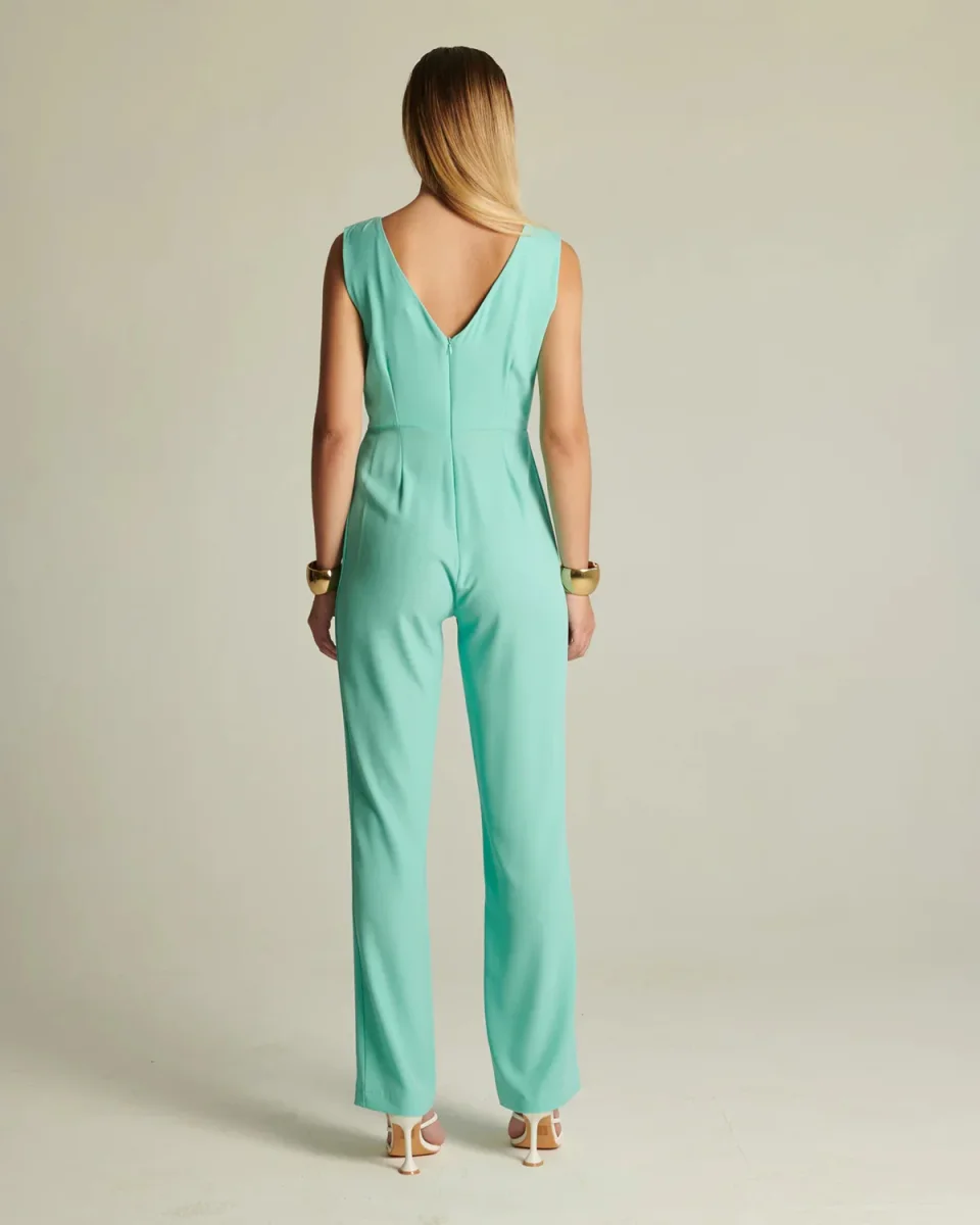 Tuta lunga elegante in morbido tessuto cady. Scollo a V, bustino morbido. Taglio in vita con dettaglio oro applicato al centro. Pantalone a vita alta con pences in vita, gamba slim e fondo dritto. Chiusura con a scomparsa sulla schiena. Taglia in foto 40. Composizione tessuto 95% poliestere 5% elastan.