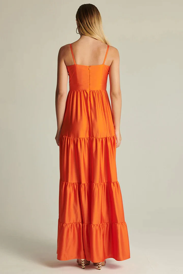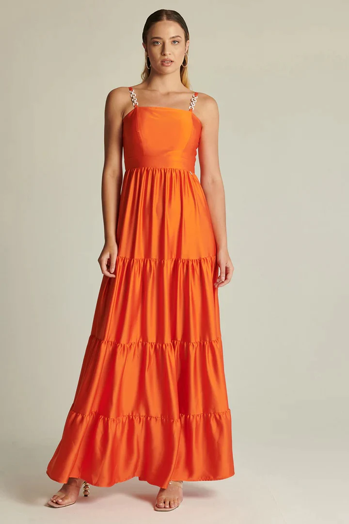Vestito lungo da cerimonia in tessuto lucido rasato. Bretelle sottili con dettaglio gioiello. Corpetto semi rigido a fascia. Taglio in vita e chiusura con zip sulla schiena. Gonna lunga a balze. Vestibilità regolare. Taglia in foto 40. Composizione tessuto 97% poliestere 3% spandex.