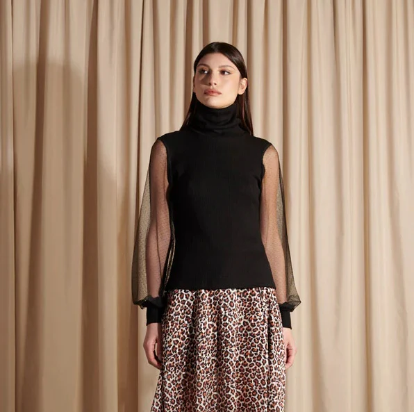 Maglia modello dolcevita in tessuto lavorato a canaletti. Collo alto morbido. Vestibilità sagomata. Ampie maniche baloon in tulle a pois, polsini in tessuto elasticizzato. Taglia in foto S. Composizione tessuto 50% rayon, 30% poliestere, 20% nylon.