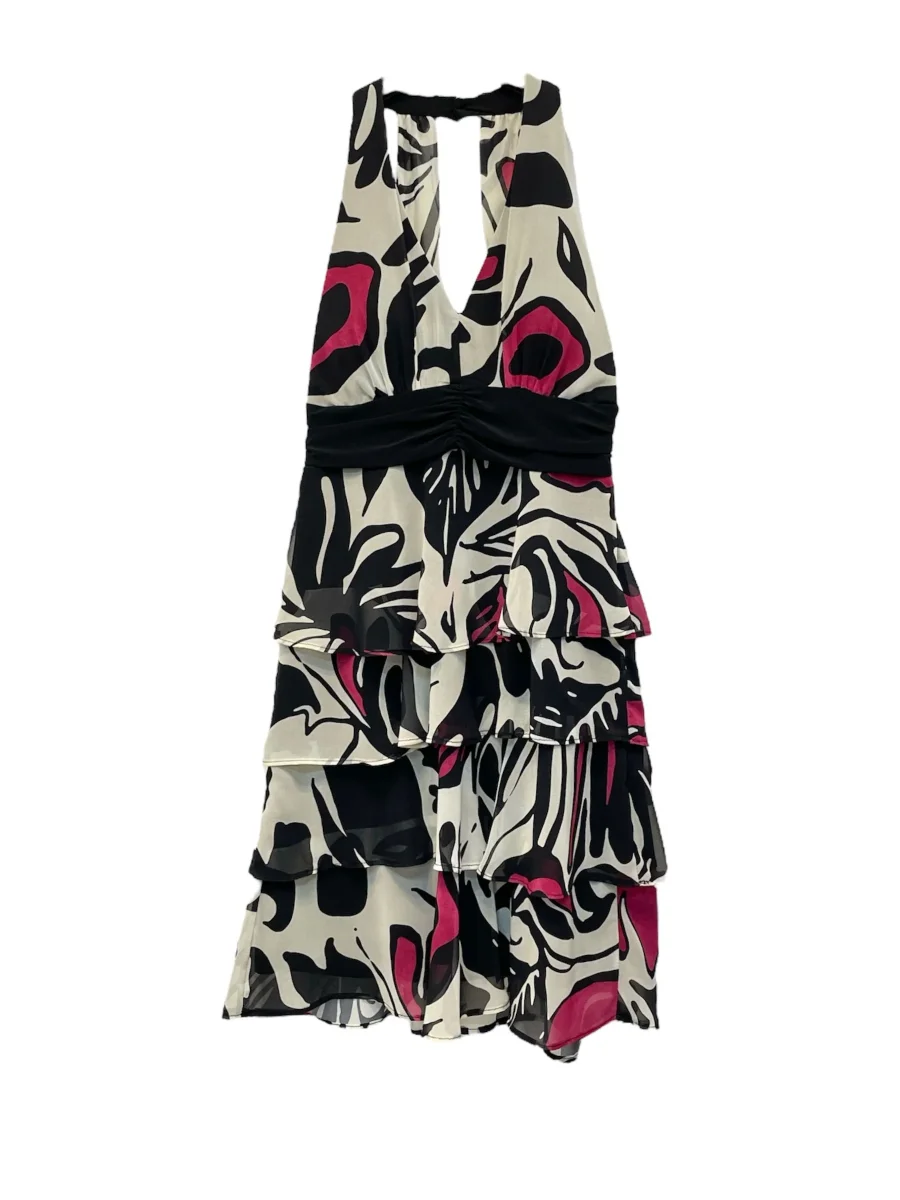Vestito corto in tessuto chiffon leggero con fodera in tessuto elasticizzato. Scollo a V con coppette interne, chiusura sul collo con bottone in tinta. Taglio in vita drappeggiato. Gonna al ginocchio con motivo a balze, fantasia stilizzata con inserti colorati. Fodera interna in tessuto elasticizzato. Vestibilità regolare. Composizione tessuto esterno 100% poliestere, fodera 95% poliestere 5% elastan.