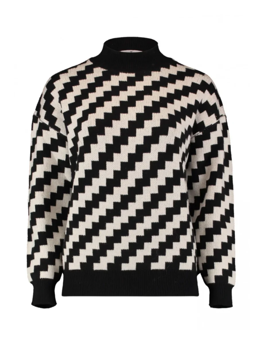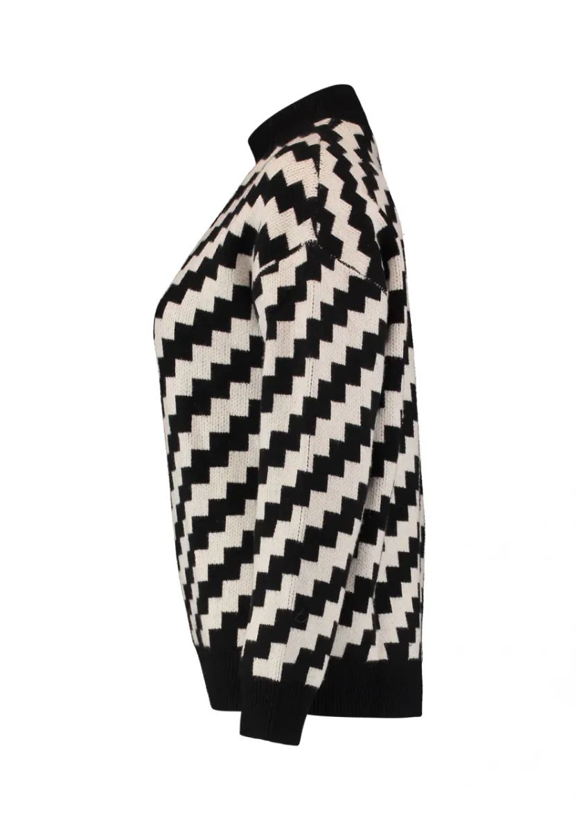 Maglia in tessuto elasticizzato misto viscosa. Collo lupetto tinta unica lavorato a costine, lunghezza regolare. Fantasia geometrica a zig-zag diagonale. Maniche lunghe con polsini elasticizzati. Vestibilità regolare. Composizione tessuto 50% viscosa 27% poliestere 23% poliammide.