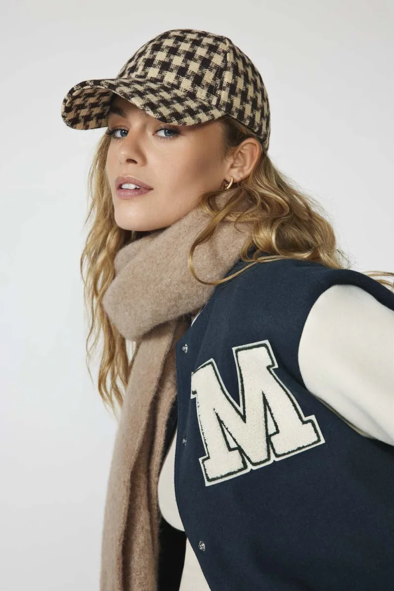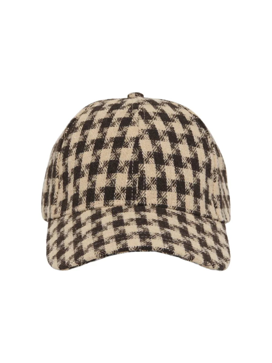 Cappello sportivo con visiera. Tessuto lavorato fantasia pied de poule. Fascia posteriore regolabile con gancio metallico per regolare la vestibilit�. Composizione tessuto 95% poliestere 5% lana.